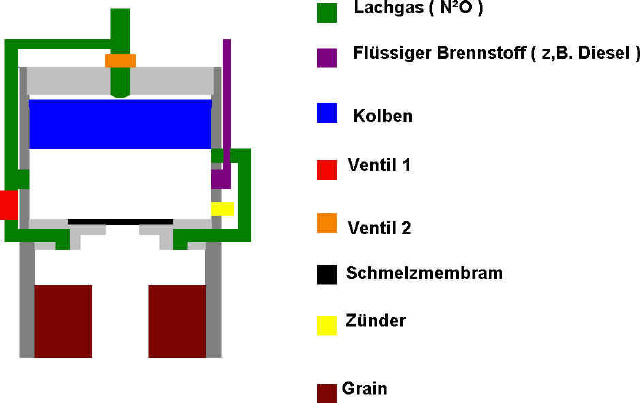 Einige Gedanken dazu: Diesel muss extrem fein zerstauebt werden, was nur mit hohen Druecken zu realisieren ist. Benzin oder Alkohol (ungiftig, einfache Handhabung) waeren hier sicher besser. Welche Temperatur benoetigen diese Gemische zur Selbstzuendung, oder muss in jedem Fall eine Zuendkerze (Funke bzw. offene Flamme) her? Welches Kompressionsverhaeltnis brauchen wir um die 600 deg C zu erreichen, damit das Lachgas sich spaltet? Welche mechanischen Belastungen haben wir dabei in unseren Bauteilen?