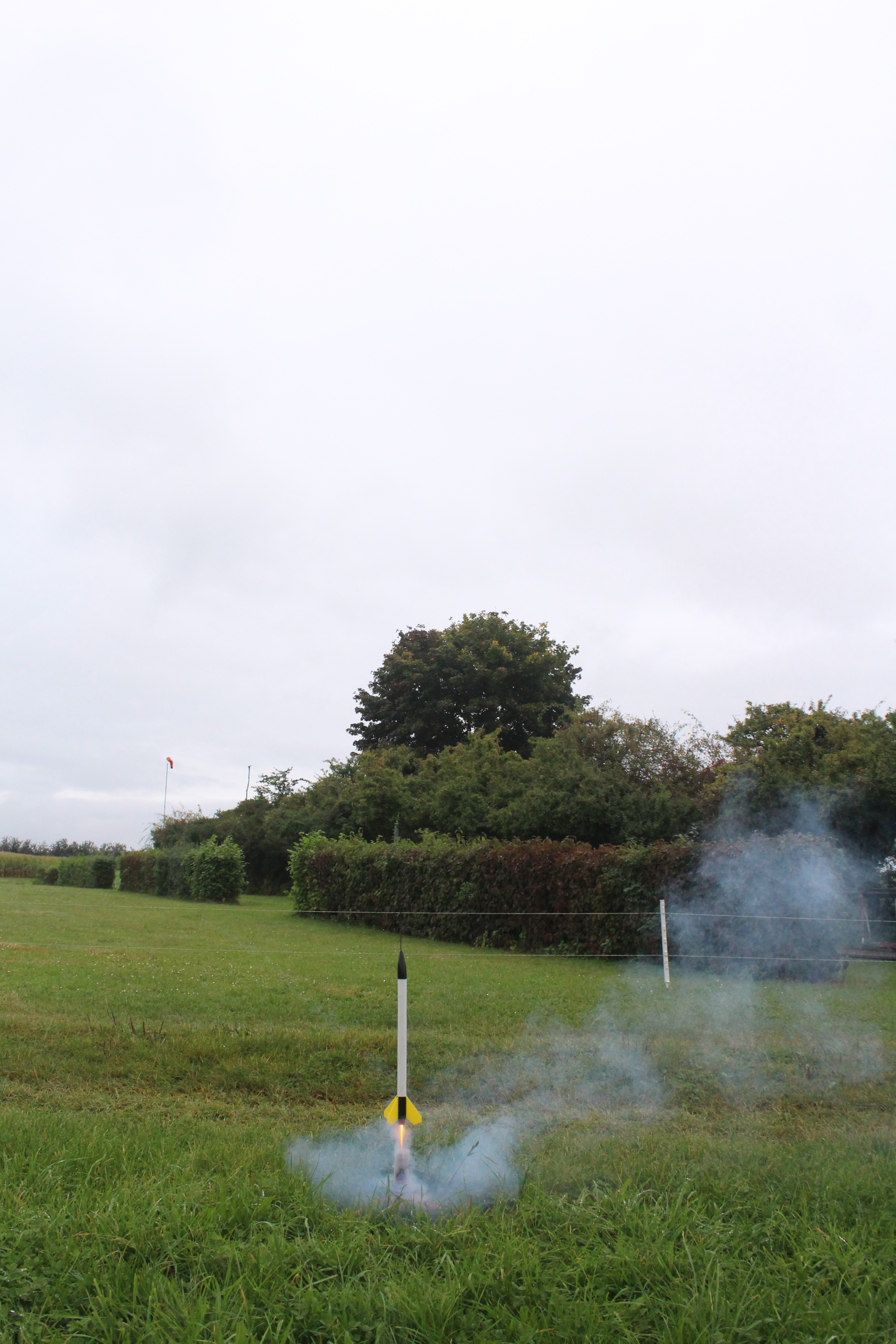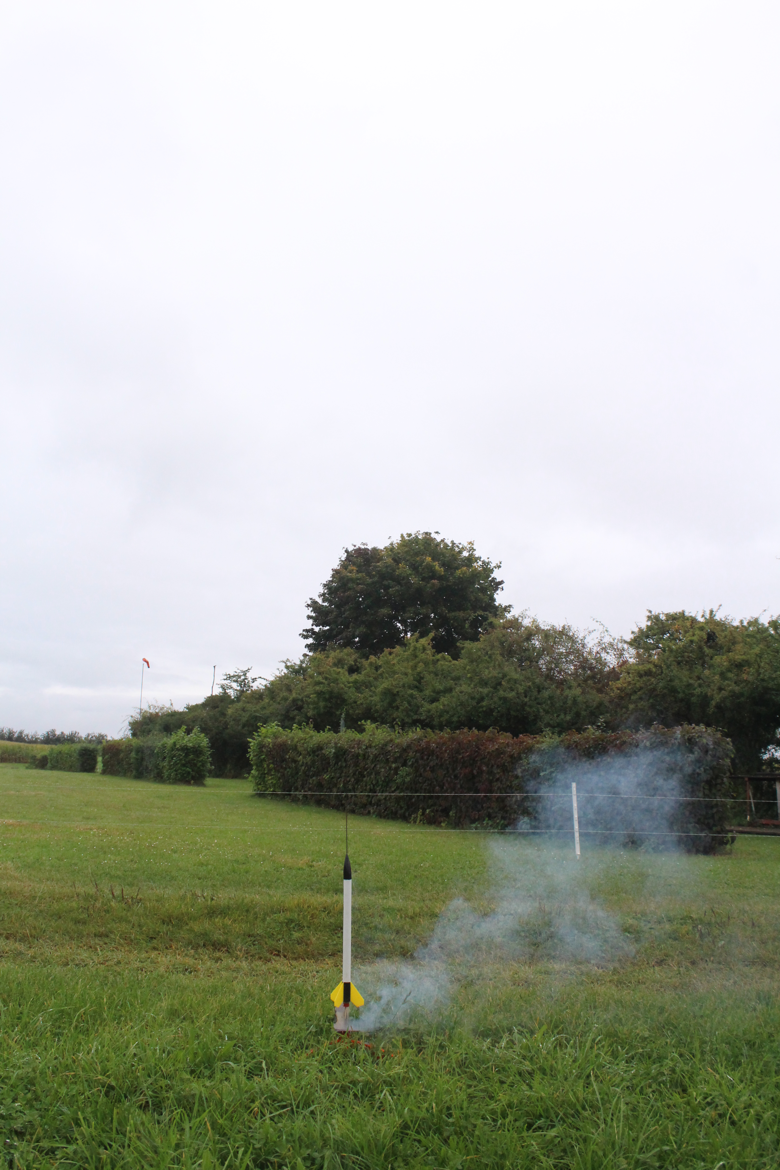 Der Treibsatz hat gezündet und die Rakete setzt sich in Bewegung. Doch scheint die Flamme, die aus der Düse desselben schießt, größer zu sein, als bei einem üblichen B4-4 Treibsatz.