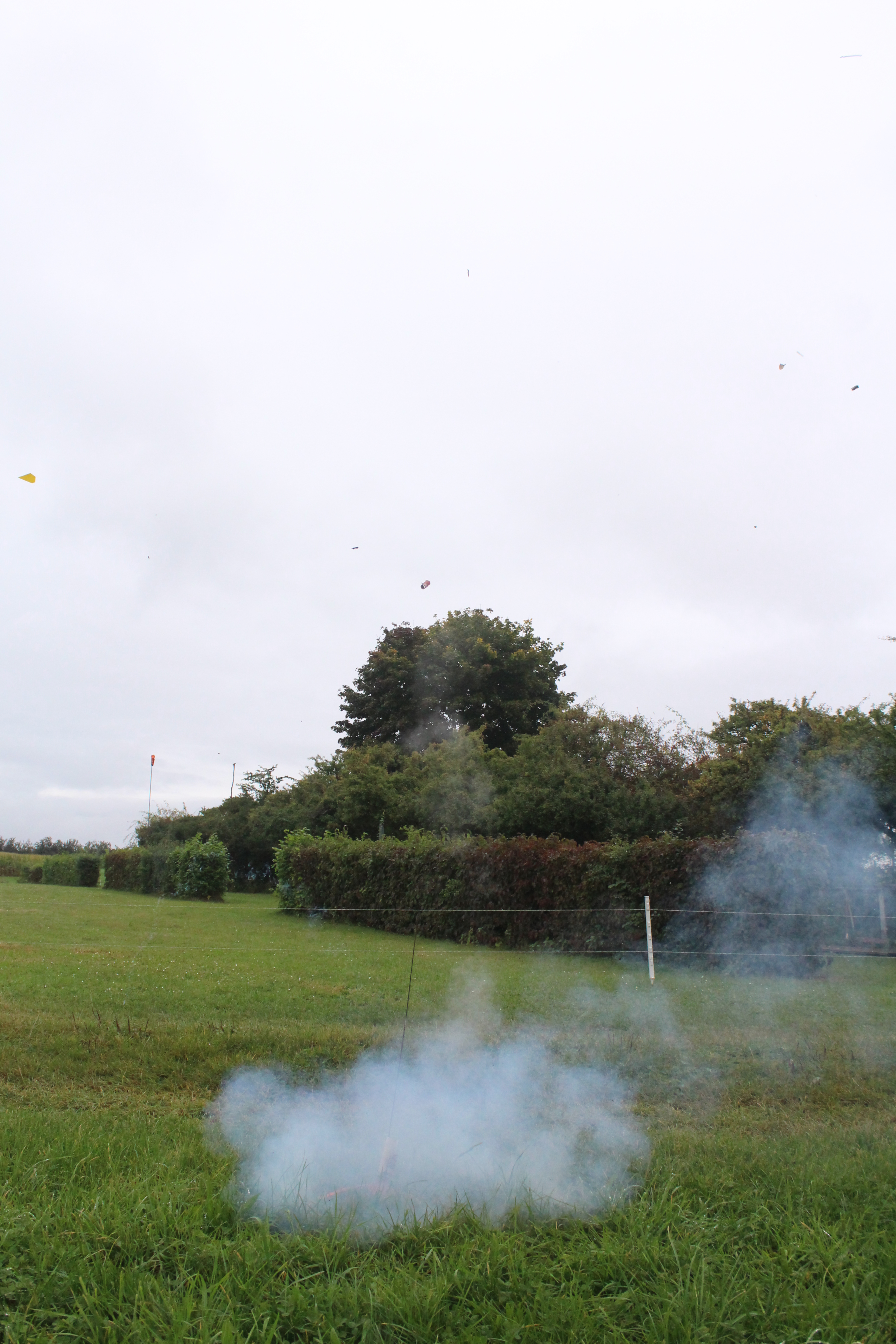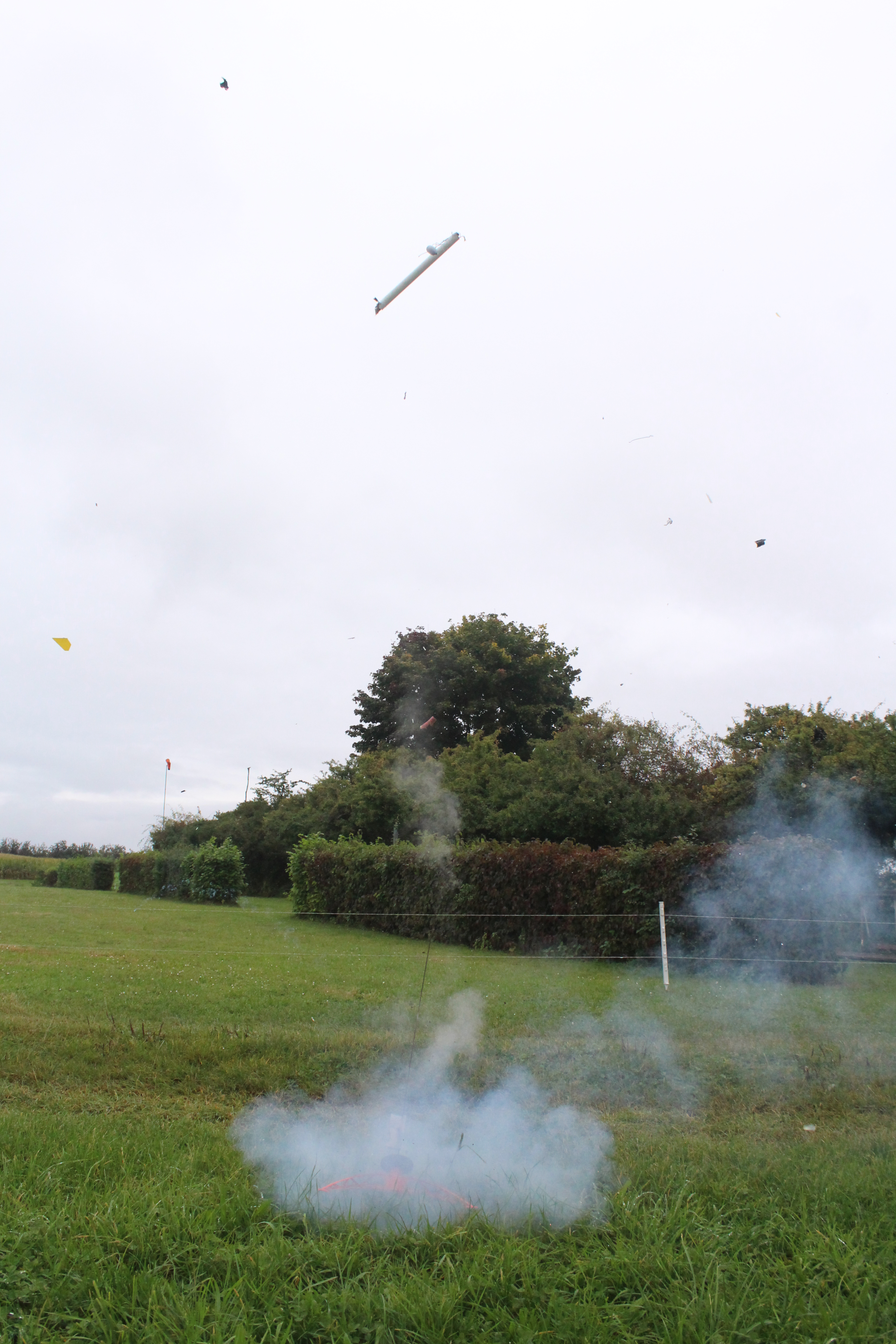 Heute, am 5. Oktober 2021, ist mir beim Start einer Modellrakete der verwendete B4-4 Treibsatz explodiert, wobei es das Heck der Rakete zerrissen hat. Kurz vor der Zündung des Treibsatzes durch eine Stoppine sieht noch alles gut aus.