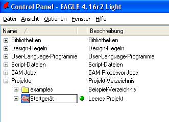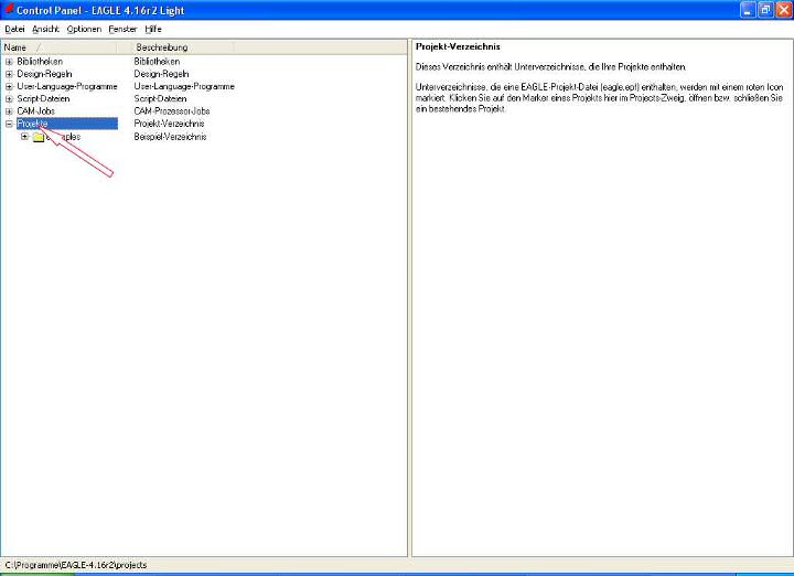 Wenn es so aussieht wie im Bild unten, dann hast Du die erste Hürde schon mal geschafft. Und das Control Panel von Eagle erscheint. Control Panel: Wir sehen eine Menüstruktur mit folgenden Komponenten: - BibliothekDort ist die Bauteilesammlung von Eagle untergebracht. Die Bibliotheken o. neudeutsch Library die Dateien haben auch die Endung *.LBR. Natürlich sind dort nicht alle Bauteile gespeichert, sondern nur eine Auswahl die Cadsoft mitliefert. Bibliotheken könnne auch selber angelegt werden oder man sucht im Internet, evtl. hat schon jemand das Bauteil eingegeben das man sucht. - Design-RegelnIn den Design-Regeln ("Design Rules") legt man alle für die Platine und deren Fertigung relevanten Parameter fest. Minimal Abstände, Leiterbahnbreiten usw... für den Anfänger nicht wichtig - User-Language-ProgrammeEine eingebaute Programmiersprache, um Abläufe zu automatisieren etc... für den Anfänger nicht wichtig - Scipt-DateienDa die Eagle Befehle auch per Tastatur über ihre Funktionsnamen aufgerufen werden können (Copy,Move,Delete usw..) So können aus diesen Befehlen auch Scripte(Befehlsfolgen) erzeugt werden (normale Textdatei) um häufige Befhelsfolgen zu automatisieren. für den Anfänger nicht wichtig - Cam-JobsAnweisungen für den Fertigungsprozess der Platine. Bohrdaten, Gerber-Dateien Wer seine Platine industriell fertigen lassen möchte, der braucht den Cam-Prozessor für den Anfänger nicht so wichtig - ProjekteDa landen die Werke die wir so designen...also die Schaltpläne(Schematic) und die Platinen(Boards) Dort könne Ordner angelegt werden, um etwas Ordnung in das Dateichaos zu bekommen. mit einen Klick auf das kleine Plus(+) können die Menüordner aufgeklappt werden !!! und mit dem kleinen Minus(-) wieder zu gemacht werden... so nun weiter