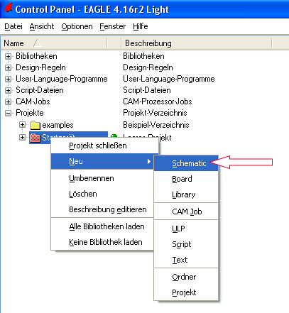 dann wieder ein RECHTS-Klick auf das erzeugte Startgerätmenu und wir wählen Neu--> Schematic Schematic --- Neudeutsch für Schaltplan !!!! siehe Bild: