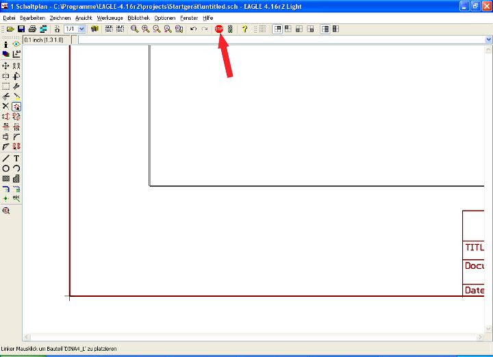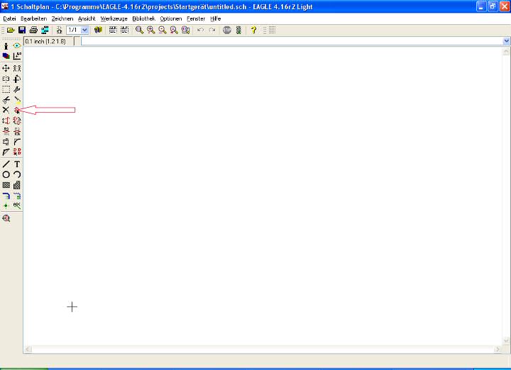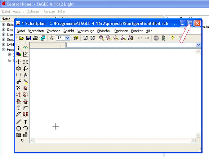 ...und der Schaltplan-Editor öffnet sich in einem neuen Fenster. Dies ist nun das Fenster, in welchem der Schaltplan gezeichnet wird !!! Wir Maximieren das Fenster (siehe Pfeil) um dann mit der Arbeit beginnen zu können..
