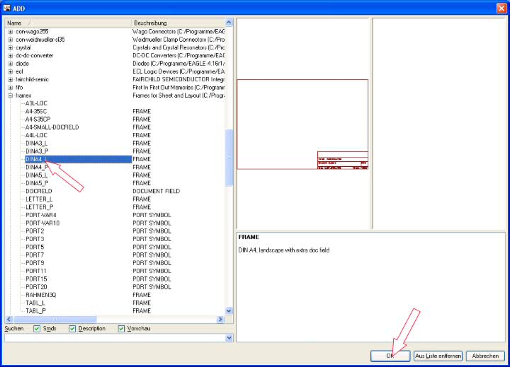 und jetzt geht der Bibliotheksbrowser auf, und zeigt uns alle Bauteile die zur Verfügung stehen. Die Biblitheken sind alphabetisch geordnet, und wir suchen die Bibliothek "frames" Na gefunden ..... einfach nach unten scrollen bis f....wie frames u. die frames durch Links-Klick öffnen o. aufklappen Dann suchen wir DINA4_L......hmm...was soll den das sein ?? Das ist ein Schaltplanblattrahmen(was für ein Wort ?!?) in der Größe DINA4 Landscape, also horizontal. Auf der rechten Seite bekommen wir angezeigt, wie das Dingens aussieht. So dann...wählen wir es mit dem OK-Button(Pfeil)