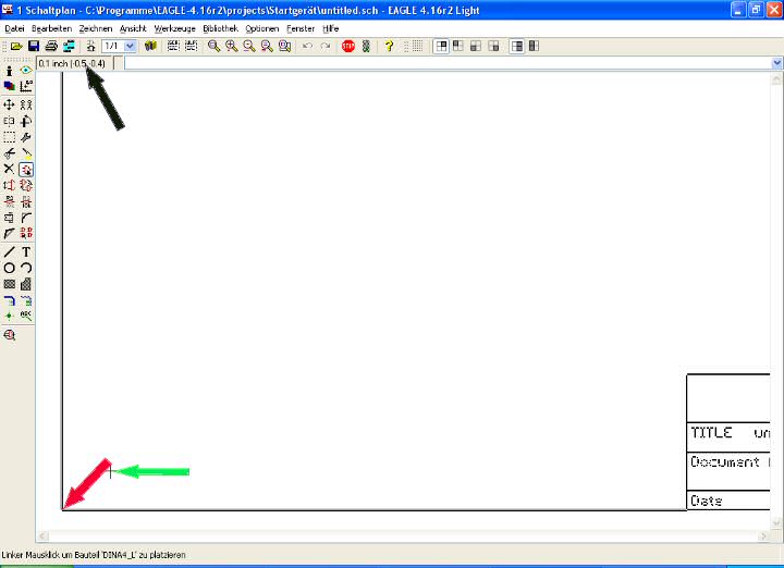 Huch....jetzt hängt ja etwas an unserem Mauszeiger....ja, das ist der gewählte Rahmen. Und der ist so groß wie ein DINA4 Blatt. Im Schaltplaneditor sehen wir im freien Feld ein Kreuz(grüner Pfeil), das ist der Koordinatensystem Nullpunkt !! Die Koordinaten bekommen wir beim "schwarzen Pfeil" angezeigt. Wir positionieren unseren Frame jetzt mit der unteren linken Ecke auf dem Nullpunkt und drücken die Linke-Maustaste...schon ist das Bauteil ähh..Frame platziert. Ist doch einfach, oder ??? aber der Rahmen hängt ja immer noch an dem Mauszeiger  Was tun ???