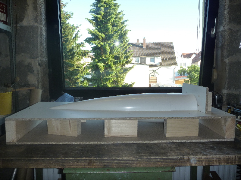 Der Formenbau: Die Spitze und das Heck der A4 sollen aus einer GFK-Form gemacht werden. Los gehts also mit der Herstellung der Form. Als Urmodell dient eine 6"-GFK-Spitze von PML. Die Trennebene der Form besteht aus einer 10mm starken, beschichteten Preßspanplatte: Die Kontur des Urmodells muss nun auf auf die Trennplatte übertragen werden. Die muss ich hier nicht vom Urmodell selbst abnehmen, sondern nutze den Rocksim-Ausdruck, was die ganze Sache natürlich vereinfacht: Danach wird die Kontur ausgesägt und bearbeitet bis das Urmodell in das Trennbrett passt: Damit sich später beim Hantieren mit der Form nichts verschieben oder verwinden kann, wird ein steifer Rahmen gebaut. Ohne diesen Unterbau würde das Trennbrett auch leicht durchhängen und keine saubere Trennebene bilden:  Nun wird das Urmodell vorbereitet. Hier erst mal Spritzspachtel aufgebracht: