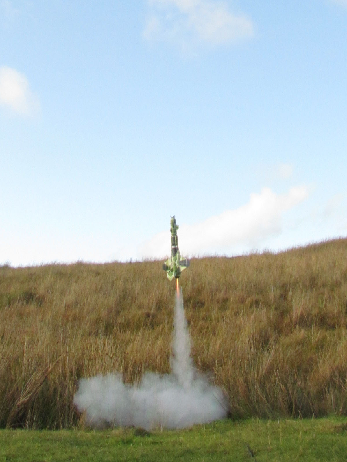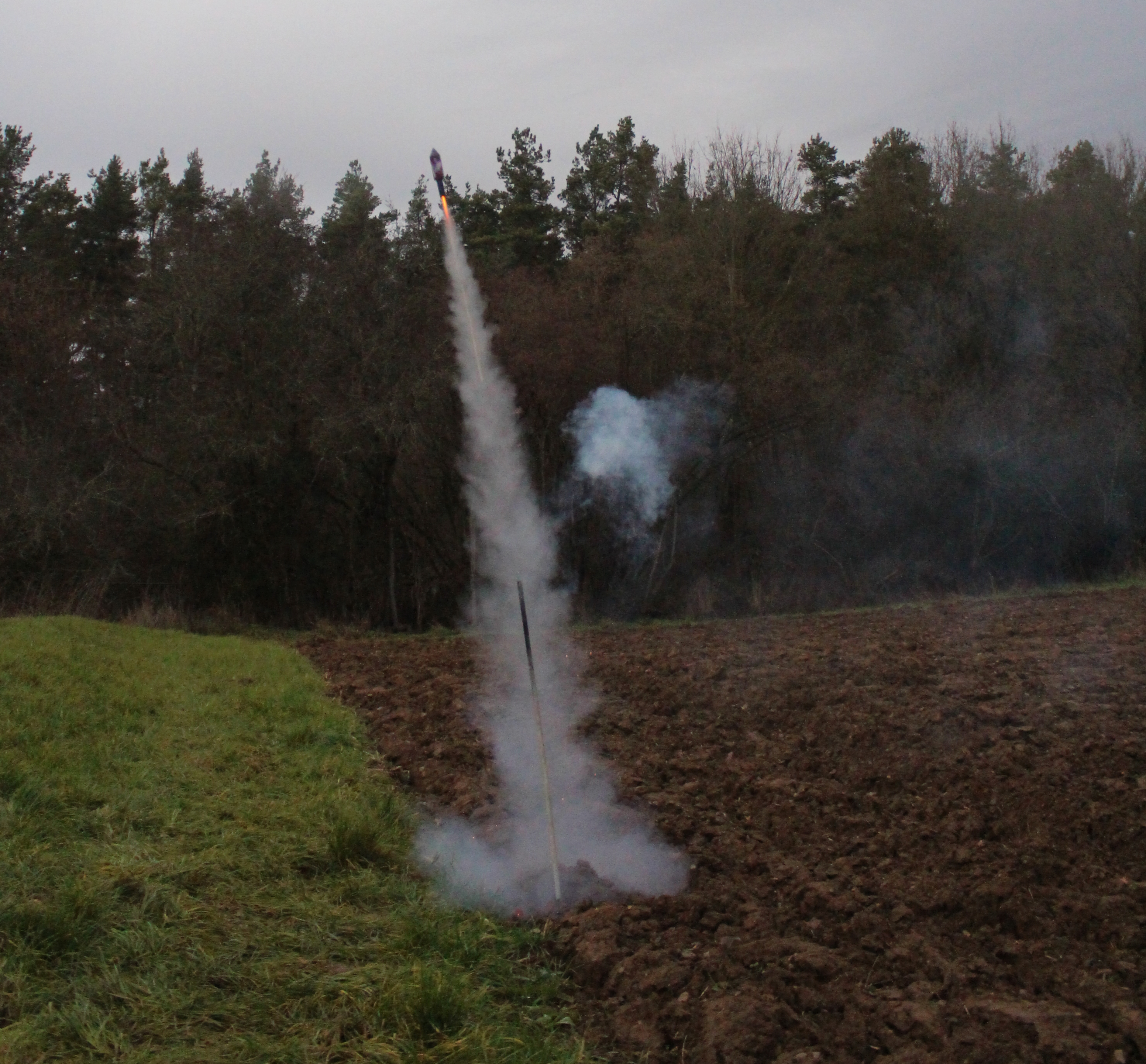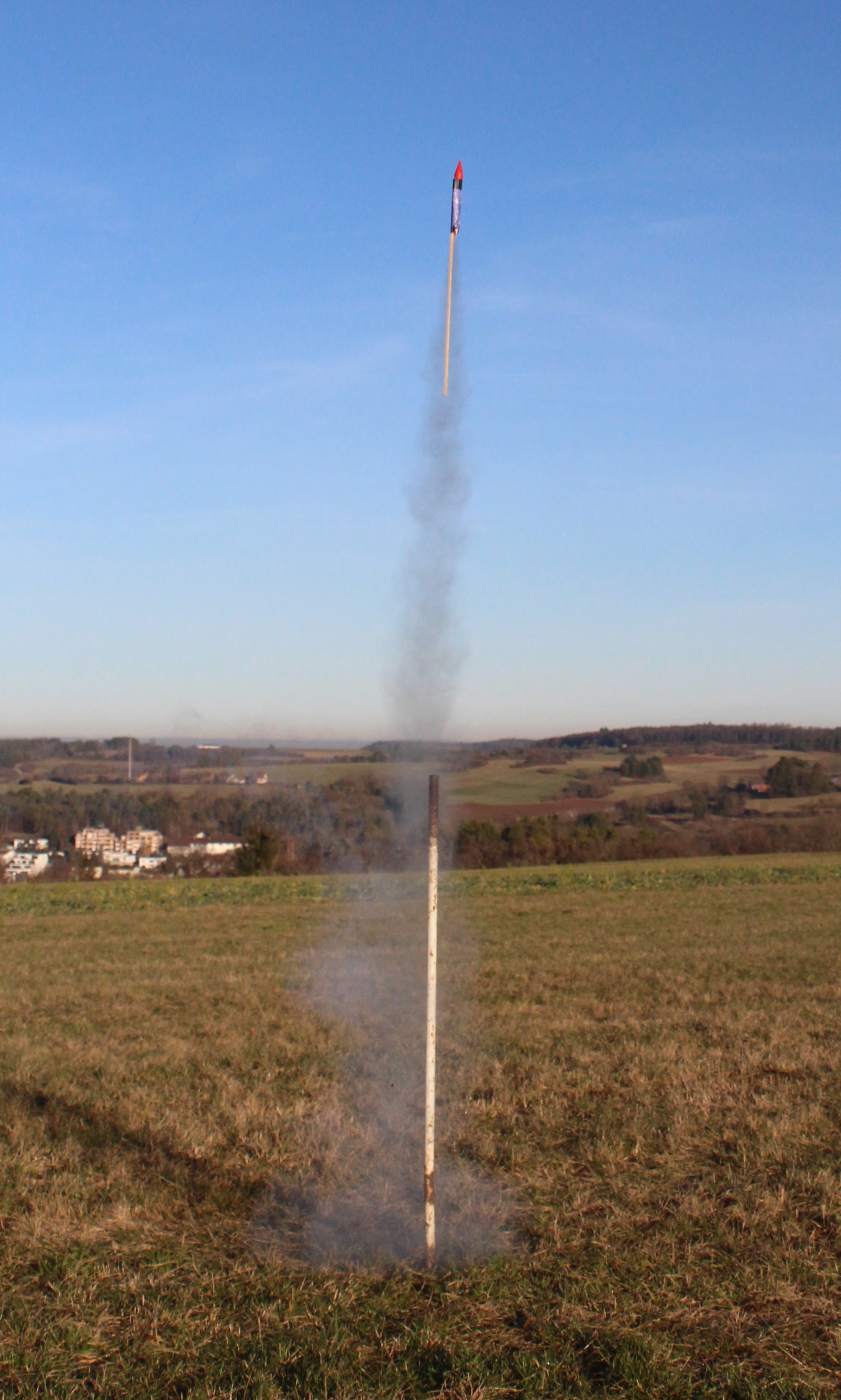 Eigentlich sollten die Treibsätze von Modellraketen und Feuerwerksraketen die gleiche chemische Zusammensetzung haben, doch sieht man auf meinen Startfotos Unterschiede. So brennt der B4-4 Treibsatz dieser Modellrakete mit einer schönen Flamme ab.