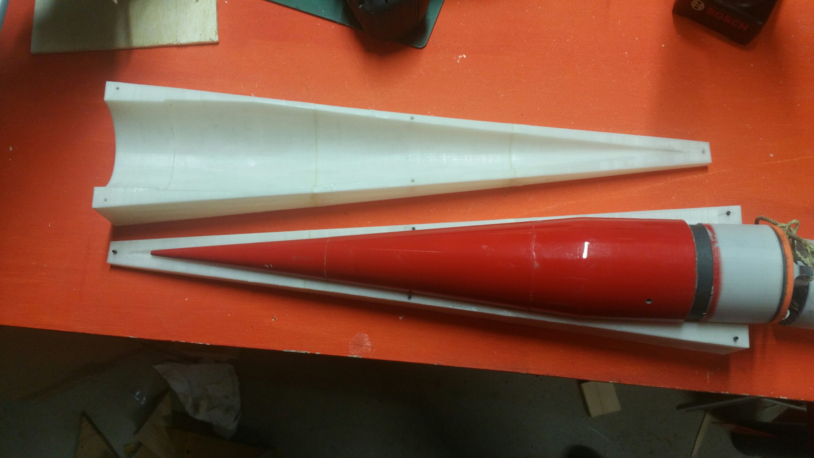 hier erkennt man die Passstifte. In den zusammengeklebten Segmenten stecken die gleichen Pinne. Die rote Spitze ist übrigens die Urform und noch direkt gedruckt. Nicht sehr haltbar, wie man an den Klebestellen erkennen kann.