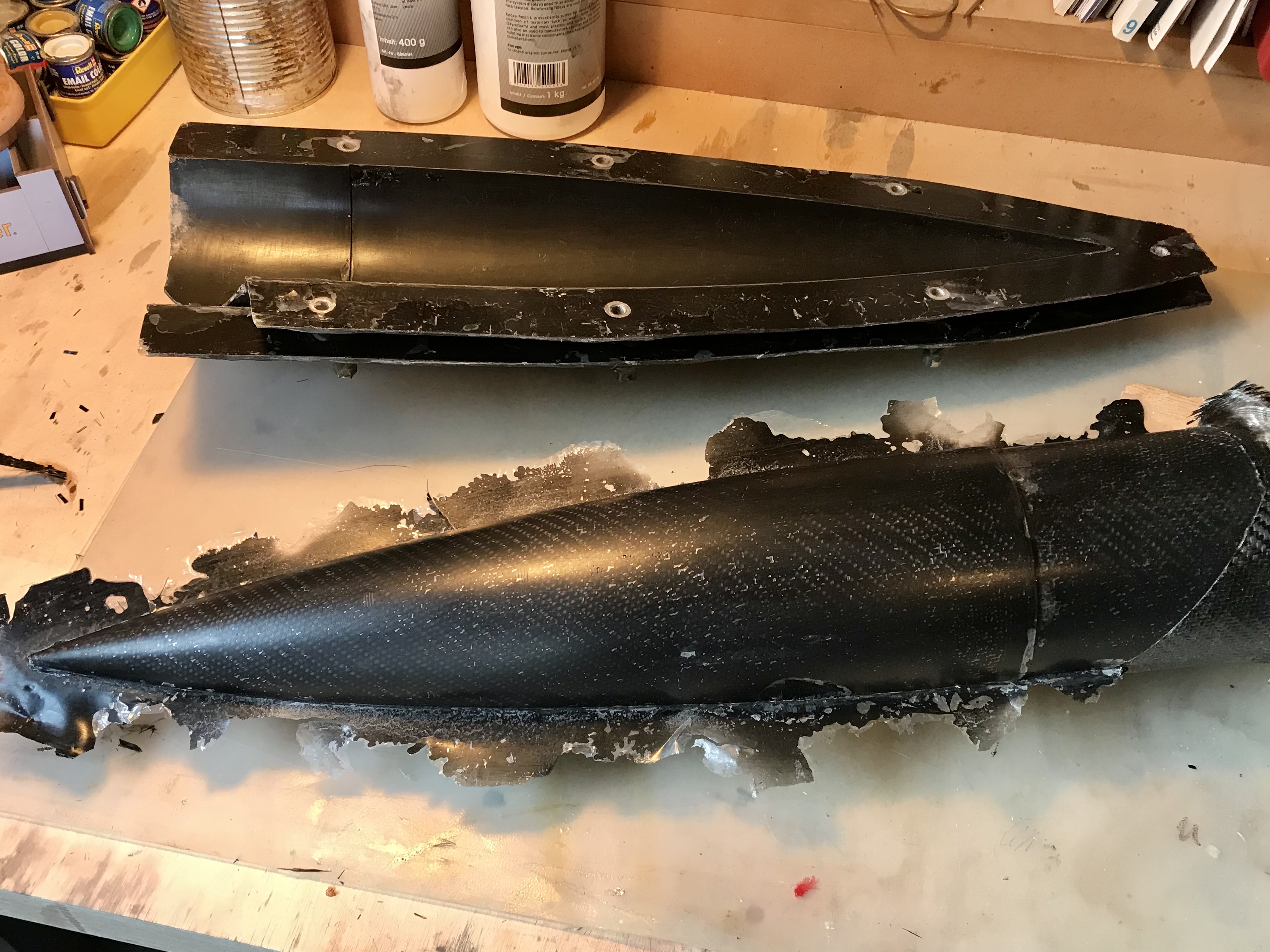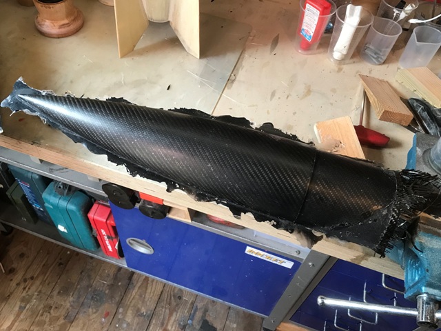 Nächster Versuch in Carbon Andreas, das ist Deine. Für die Form. Form vorgestrichen mit angedicktem, leicht eingefärbtem Harz, 1x Carbon ?g/m², Köper SpreadTow, als Finish 1x Carbon 100g/m² Biagonalgelege 45°/45° als Unterbau Im Kuppler noch eine Lage irgendein Rest zur Verstärkung. Schulter, Nahtstellen und Spitze mit mit Glasballons angedickter und tiefschwarz gefärbter Matsche gefüllt. An der Längsnaht überlappt das Unterbaugewebe etwa 2cm, Spitze mit Faser- und Microballon-Matsche vollgedrückt. 200g, sauberes Finish. So kann das weitergehen. Jan