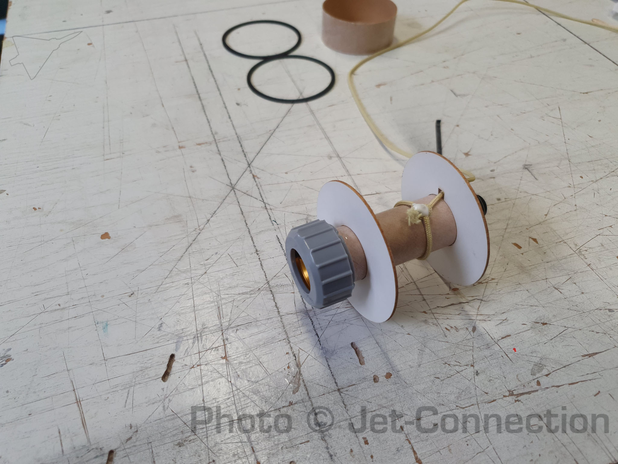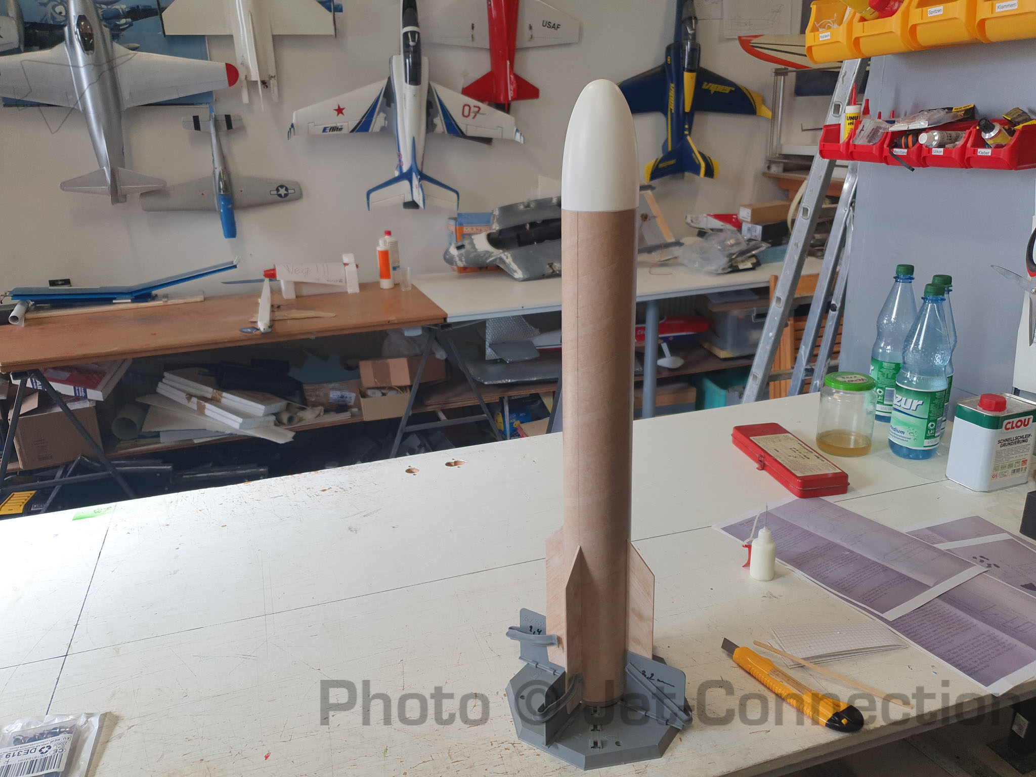 Guten Morgen zusammen. auf dem Flohmarkt hier im Forum hatte ich die Gelegenheit ein paar ältere Raketenmodelle zu erstehen unter anderem auch eben die Hellfire von The Launchpad. Die Anleitung war leider nicht vorhanden aber dank der Kollegen im Rocketryforum konnte ich eine digitale Kopie bekommen. Am Wochenende ging es los. Der Motormount ist soweit fertig und mit einem Schraubretainer anstatt des beiliegenden Motorhakens versehen. So kann ich 24mm Motoren und mit einem Adapter eben auch 18mm Motoren einsetzen. Auf den Bildern ist die Kevlarschnur noch nicht ganz am vorderen Spant da die ganze Geschichte noch trocknen muss. Die untere Verkleidung ist vorbereitet. Ursprünglich sollte der schmale Konus aus Papier gerollt werden und mit Sekundenkleber gehärtet werden aber ich habe mich für dünnes (selbst laminiertes) GfK entschieden. Ist mit Sicherheit die dauerhaftere Lösung. Auch der Papierhalter für die Schockleine gefiel mir nicht wirklich. Ich habe daher eine Kevlarschnur am Motormount angebracht an der nachher die Schockleine befestigt wird. Da Bilder bekanntlich mehr sagen als tausend Worte... Here we go
