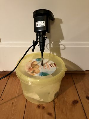 Auf dem Bild ein Eimer mit gut verschließbarem Deckel. In diesen ist ein Loch gebohrt und solch ein Adapter eingesetzt, der mal zum Aufpumpen von Bällen mit einer Luftpumpe diente. Auf den wurde ein PVC-Schlauch geschoben. So hat man jetzt eine Art "Vakuumkammer". Sie wird ausgepumpt mit einer Luftmatratzenpumpe, und zwar solch einer, mit der man auf einer Seite Druck, an einer anderen Seite Unterdruck erzeugen kann.
