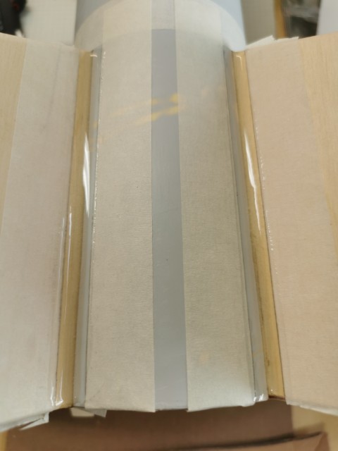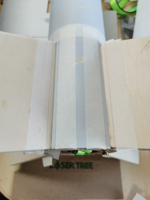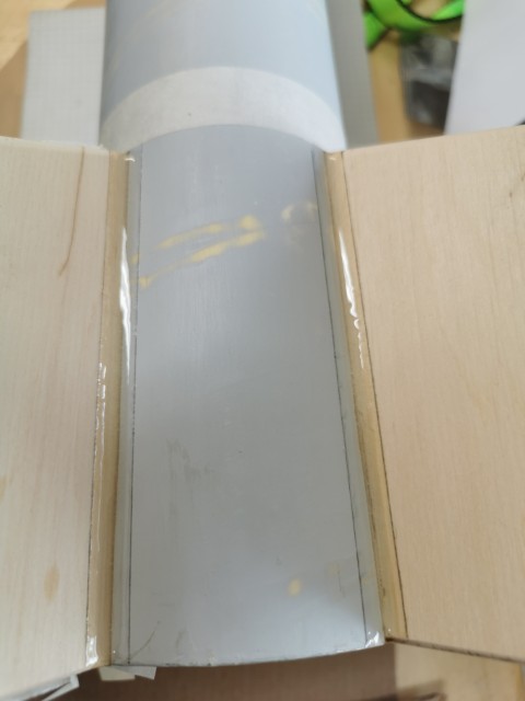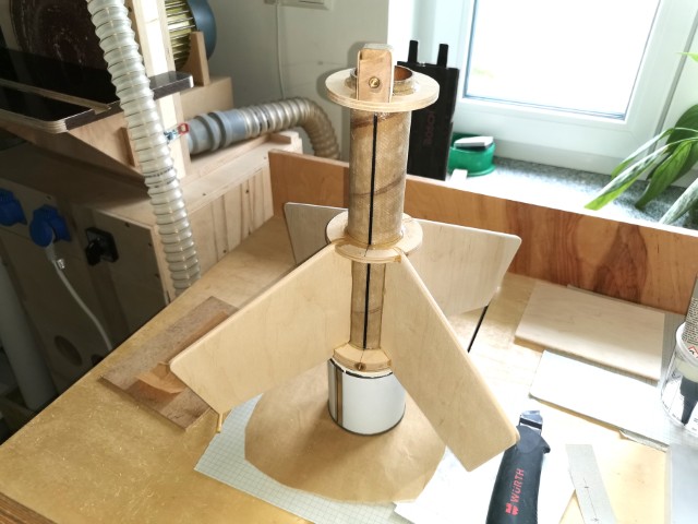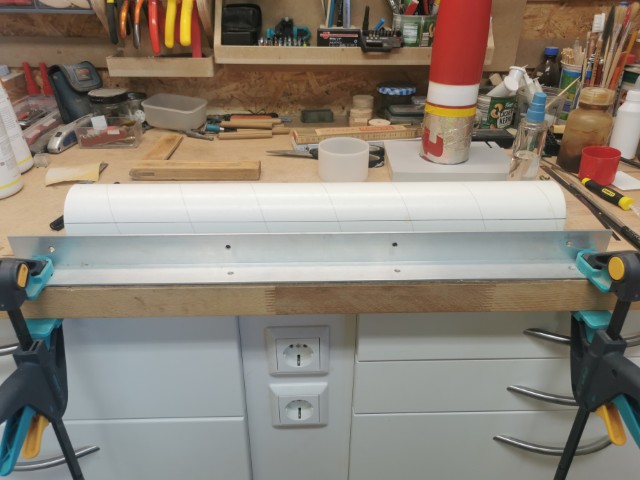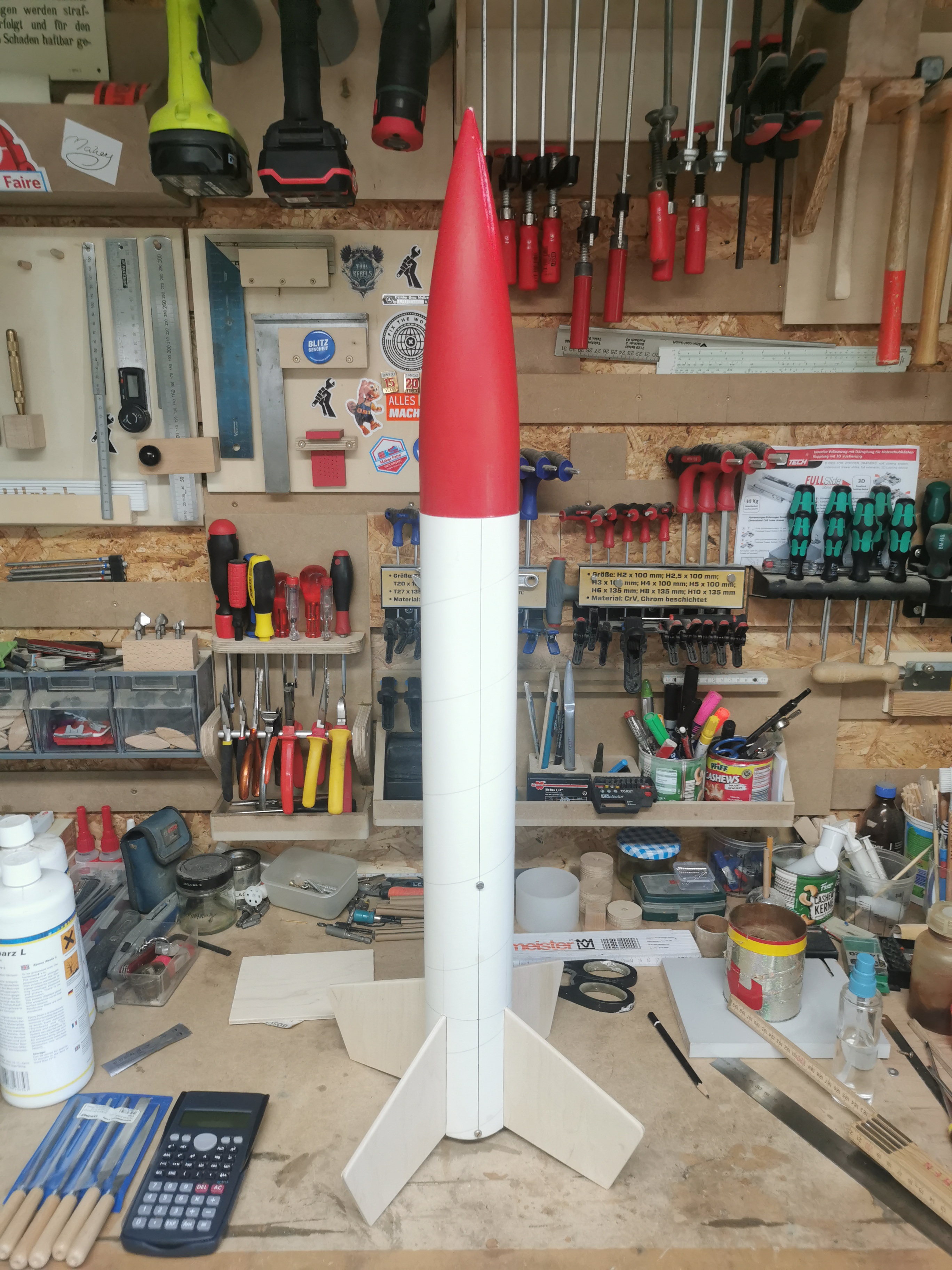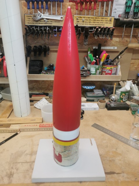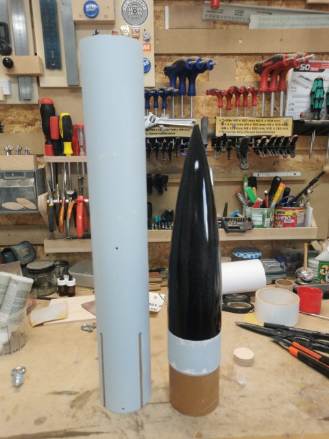 Vom Körperrohr 50mm abgeschnitten, soll als E-Bay für Altimeter dienen. Körperrohr gespachtelt, gefillert und geschliffen, alles noch ohne Finnen-Sektion. Lässt sich so besser schleifen, unten bei den Schlitzen einfach einen Kuppler eingeschoben.