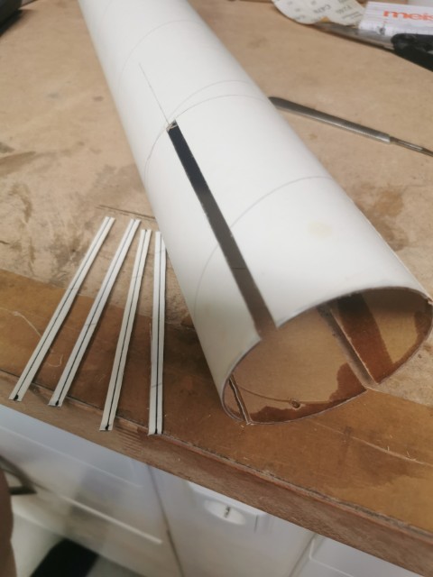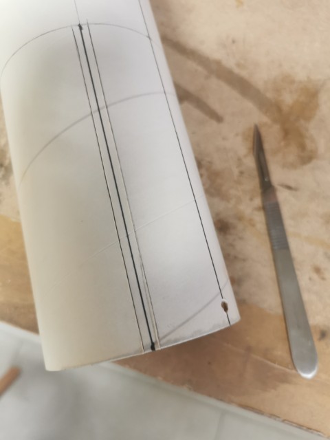 .....so es ging weiter mit dem Bau der Goblin. Referenzlinie auf dem Körperrohr angezeichnet(bei mir immer die Position der Railguides) danach die Schlitze für die Finnen angezeichnet und aus geschnitten, mit Skalpel.