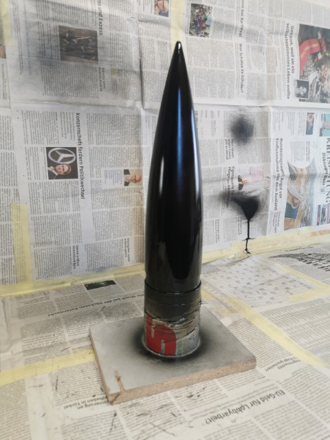 Als nächstes war die Spitze dran. Die Spitze war ein Überbleibsel eines anderen Raketenprojektes, und schon mal rot lackiert mit 2K-Lack. Lack nass angschliffen um sie für die Goblin schwarz zu lackieren. Als Lackierhalter dient ein Stück Körperrohr von meiner gecrashten Sprint und nun in Schwarz !! ist trotz Sprühdosenlack, ganz gut geworden