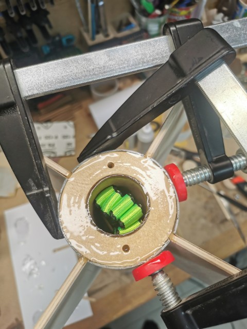 Dann Spanten, Motorrohr und Finnen mit Epoxy zusammen gefügt. Löcher für Gewindeeinsätze(M4) der Railguides noch gebohrt und eingeklebt.