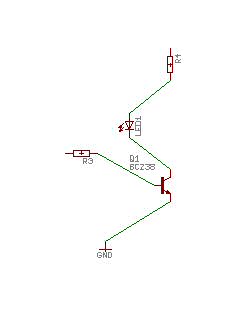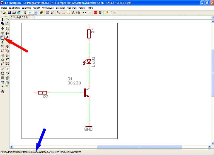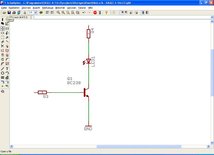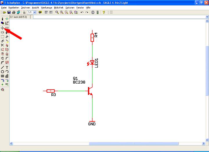 so wenn wir das verstand haben, dann können wir ja einen Teil des Startgeräts schon mal verdrahten. Zwei Widerstände, eine Led, Transistor(NPN), und ein Masse-Symbol(GND). Masse-Symbol findet sich in der Bibliothek supply1 und heisst GND (Ground). Das Ganze können wir dann so verdrahten, wie auf dem nachfolgenden Bild. (Bauteilbezeihnungen können variieren)