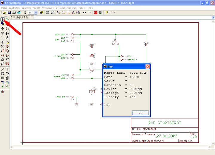 So nun weiter, mit einem neuen Befehl, dem INFO Befehl !!!! Diese gibt uns nähere Info über verwendete Objekte in Eagle (Bauteile, Netze, Leiterbahnen usw.) Die Anwendung ist ganz einfach, wir klicken den Befehl INFO mit der Maus an(links) und klicken dann auf das Bauteil, Netz usw., es erscheint dann ein Fenster mit den näheren Informationen !! z.b Bauteilname, Position, Wert, Drehrichtung, Bibliothek usw.. siehe Beispiel LED1: