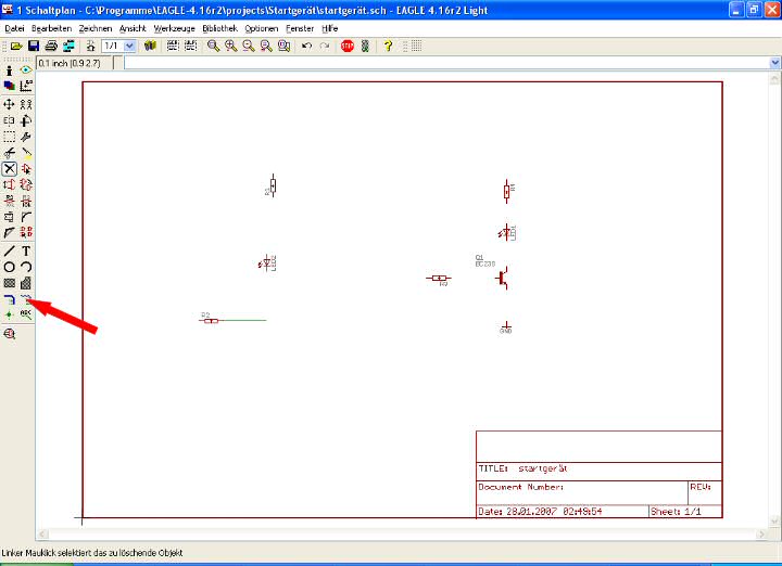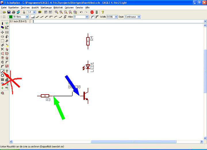 !!! Korrigiert !!! Ja, nun gut ...so ein paar Bauteile (falls noch welche da sind, und nicht alle gelöscht sind  ) brauchen ja auch eine Verbindung (NETZ) untereinander.  Habs in Handbuch nochmal nachgelesen, seither zwar immer mit Wire gemacht ?!?! Es gibt einen Net-Button(roter Pfeil) neu und mit diesem Net können die Verbindungen zwischen den Bauteilen gemacht werden. Zuerst wird das eine Ende gewählt(Linksklick) und dann zum anderen Ende mit der Maus gefahren(Linksklick). Also wenn nur eine Verbindung zwischen zwei Bauteilen gezogen werden muss, dann einmal Linksklick am Anfang der Verbindung(grüner Pfeil) und einmal Linksklick am Ende der Verbindung(Blauer Pfeil).