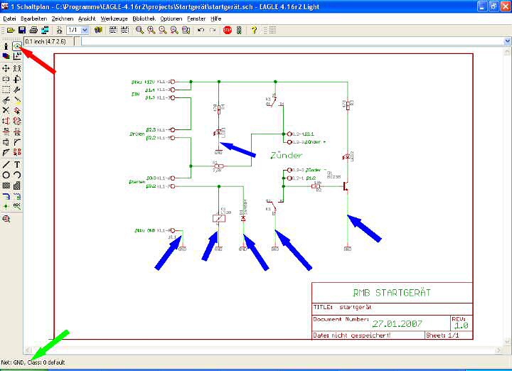 Ein Links-Klick auf den Show-Button(roter Pfeil) und dann auf das Netz(Verbindungen), die wir prüfen wollen klicken(links) Es wird die Verbindung hellgrün angezeigt und die Verbindungsstücke an den Bauteilen rot. Nun kann man erkennen, ob das Bauteil auch angeschlossen ist, oder ob keine Verbindung besteht. Siehe in dem Beispiel unten mit dem Netz GND. Alles was mit GND verbunden ist, wird hervorgehoben !!(blauer Pfeil)