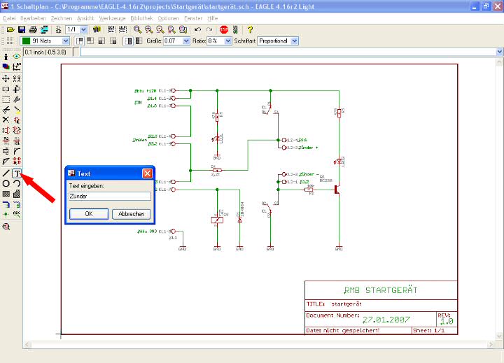 Eventuell möchte man auch seinen Schaltplan mit irgendwelchen Bezeichnungen beschriften o. auch nur das Datenfeld der Schaltplanblattes ausfüllen, dazu gibt es den Befehl TEXT.
