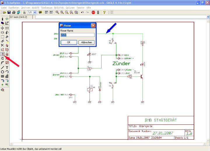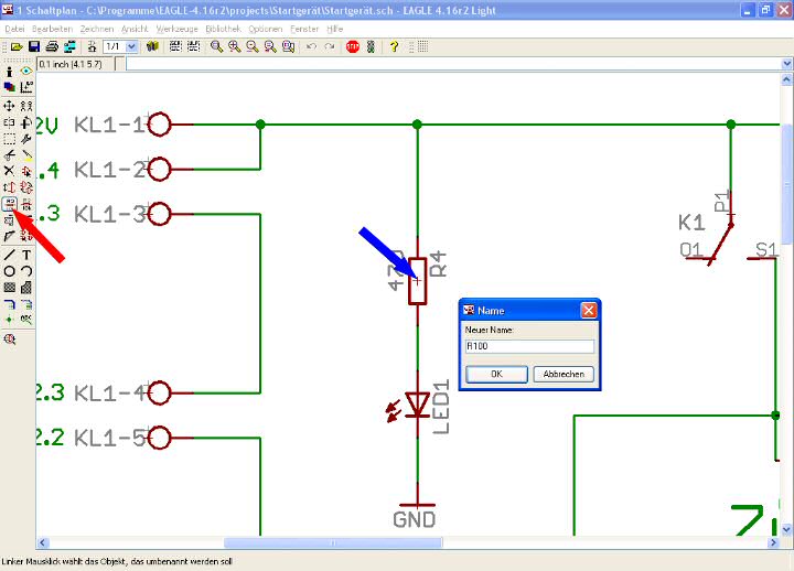 Es wird der Befehl NAME angeklickt(links) und dann das Bauteil, das wir umbenennen wollen. Es erscheint ein Eingabefenster, in welches wir den neuen Namen eintragen und mit OK bestätigen.