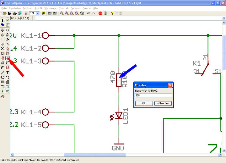 Er wir einfach angeklickt(links) und dann das Bauteil, von welchem wir den Wert ändern wollen. Es öffnet sich auch ein Eingabefenster wie beim NAME-Befehl, nur dass jetzt der Wert(z.B. 10K) eingegeben werden kann.