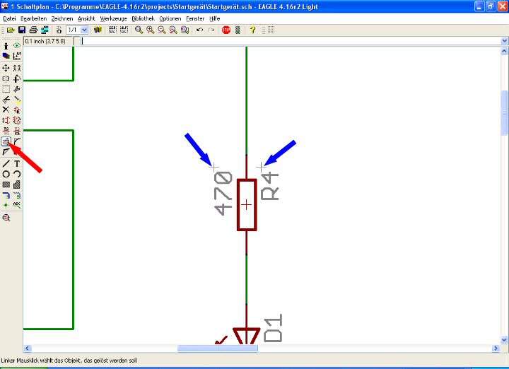 Es wir der SMASH-Befehl angeklickt(links) und dann das Bauteil, dessen Beschriftung wir vom Bauteil "lösen" wollen. Zunächst erkennt man nicht viel beim Anklicken des Bauteils, es erscheinen nur unscheinbare Kreuzchen.(siehe Bild)