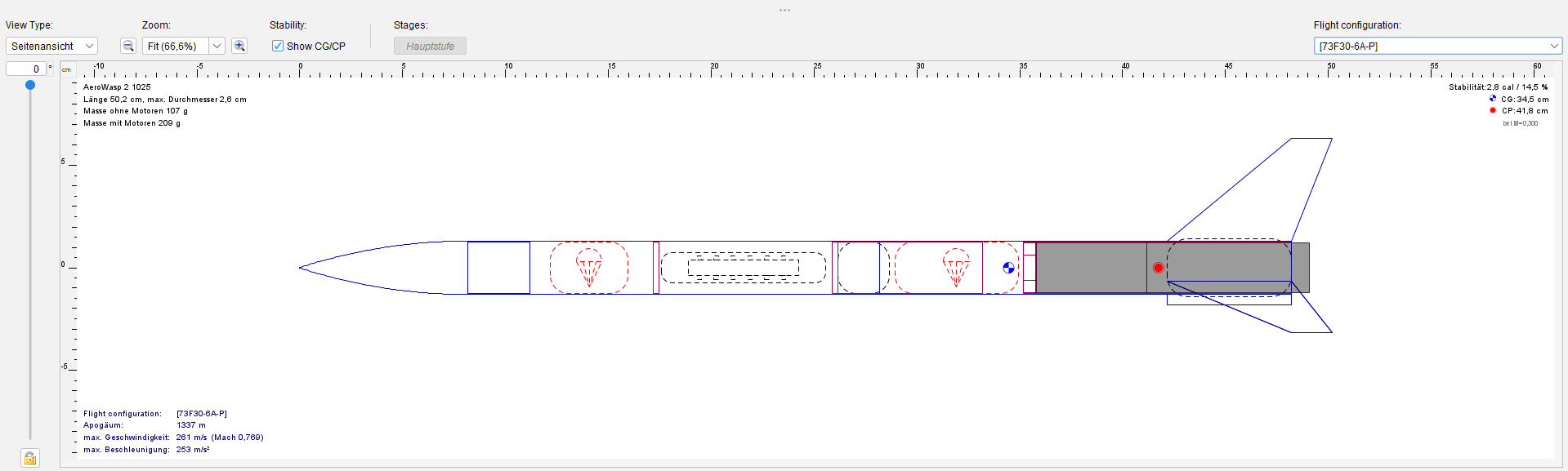 Nun aber zum größeren Problem: Als Motor wollte ich bisher einen F30 von Cesaroni verwenden, laut OpenRocket fliegt die AeroWasp 2 damit auf 1337 m Höhe (mit 50 g Nutzlast für Altimeter & Co), wenn man die Ausstoßladung entfernt. Erst heute habe ich aber gelesen, dass die Motoren von Cesaroni zurzeit alle unter P2 fallen. Mit dem AeroTech F35 würde die AeroWasp 2 auf 1109 m kommen (auch mit 50 g Nutzlast), und ich kann nicht einschätzen, ob das auch unter Realbedingungen so wäre. confused