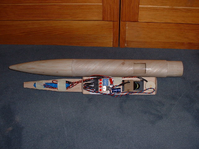 Man kann in der oberen Hälfte das kleine Fenster für Kamera sehen. Die Kamera ist so eingebaut, das sie schräg nach unten schaut, aber keine Röhre sieht. die Flossen sind bei einem Flug um 60° gedreht. In der ganzen oberen Sektion und Spitze befindet sich die Elektronik: Folgende Datei wurde angehängt: