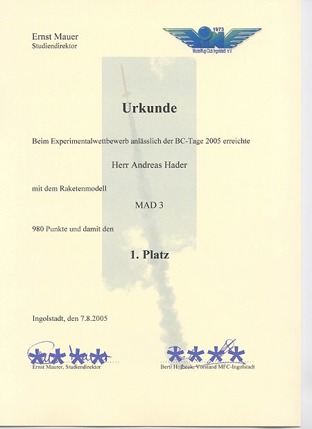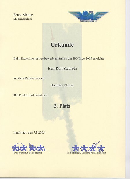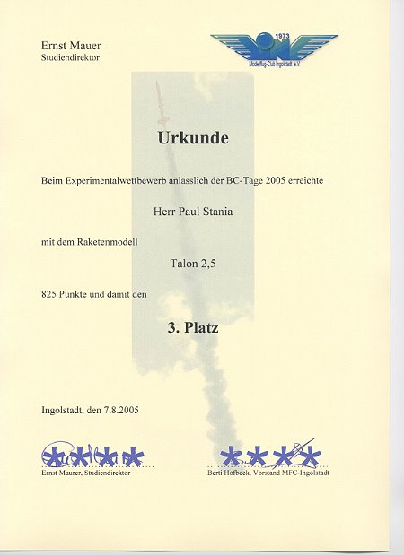 anlässlich der BC-Tage 2005 Platz - Punkte - Name - Name des Modells 1 - 980 - Andreas Hader - MAD 3 2 - 905 - Rolf Stabroth - Bachem Natter 3 - 825 - Paul Stania - Talon 2,5 4 - 706 - Ulrich Nieland - Thor 3 5 - 689 - Gert Brzelinski - Jonny 6 - 502 - Hans Marx - Fat Boy 7 - 338 - Roman Snajdr - No Name Anmerkung: Die Vergabe des „Jugendpokals“ wird ausgesetzt. Begründung: a) Von den beiden Teilnehmern hat nur einer sein Modell gestartet. b) Die Funktion des Experiments (wesentlicher Bestandteil des Wettbewerbs) konnte aber wegen Fehlfunktion nicht gewertet werden. Ingolstadt im Dezember 2005 Ernst Maurer Geändert von Tom am 05. Dezember 2005 um 20:09 |
