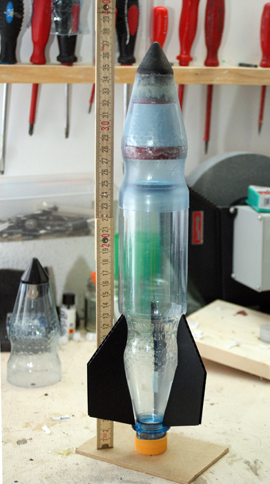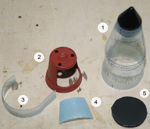 Hallo zusammen. Ich baue gerade eine 0,5 Liter Wara. Die soll natürlich nach dem Flug nicht einfach so vom Himmel fallen, also muss da auch noch ein Fallschirm mit untergebracht werden. Siehe da, Platz ist in der kleinsten Hütte. Hier mal eine Übersicht der Komponenten: (1) Das obere Modul mit der Spitze (von einer Silvester-Rakete) udn dem fertigen Ausschnitt für den Fallschirmauswurf. (2) Kleiner Blumentopf als Fallschirmkammer (mit fertigem Ausschnitt) (3) Auswurffeder (PET-Streifen) (4) Die Klappe (Tür) (5) Boden der Fallschirmkammer (PP-Hohlkammerplatte) Hier die Teile nach den nächsten Schritten: (6) Spitze eingeklebt und für die Lackierung vorbereitet. (7) Auswurffedern an der Kammer montiert (Mit beidseitigem Klebeband und Drahtklammern) (8) Bodenplatte mit Durchführung (9) Tür (2-Lagen PET) (10) Platte zum Befestigen der Fallschirmkammer (wird innen unter die Spitze geklebt, dann die Fallschirmkammer daran kleben.) Alles zusammengebaut (Die fertige Spitze) Und hier die Spitze mal testweise auf den Druckkörper gesteckt.