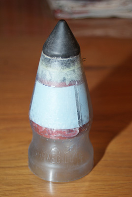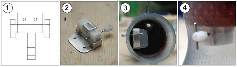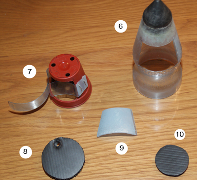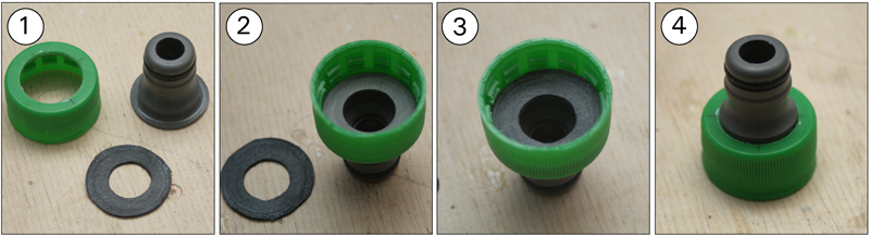 Weiter gehts - Die nächsten Arbeitsschritte ... Der Einbau des Tomy-Timers (1) Die Schablone für den Alu-Halter (Der Halter kann festgeschraubt oder -geklebt werden) (2) Timer in dem Halter (3) Timer in der Rakete (Befestigt mit beidseitigem Klebeband - von Tesa zur Spiegelmontage) (4) Timer außen mit Stift Der Bau der Düse (Meine erste Düse in dieser Bauart, war echt einfach) (1) Komponenten - Flaschendeckel mit Loch - Gardena Hahnstück 21mm (G 1/2") - passend geschliffen - Gummidichtung (Aus einem Fahrradschlauch geschnitten) (2) Gardenastück im Deckel (3) Dichtung rein (4) fertig