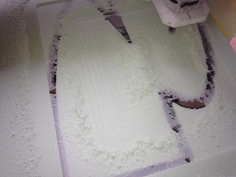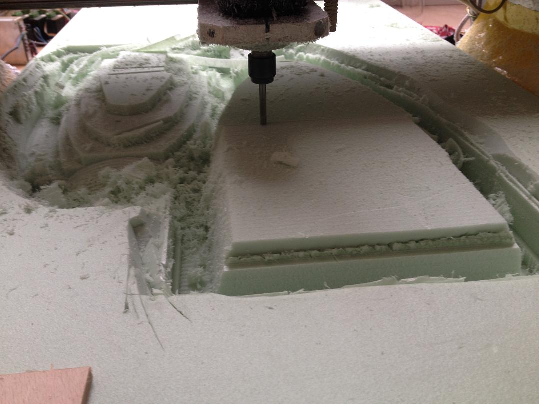 Gestern ist das Styrodur gekommen, habe ich bei sansys.de bestellt. Die Qualität ist sehr gut, relativ fest, im Vergleich zu den rosa Baumarktplatten. Also auf die Fräse damit, und 1,5 Stunden viel Dreck machen: