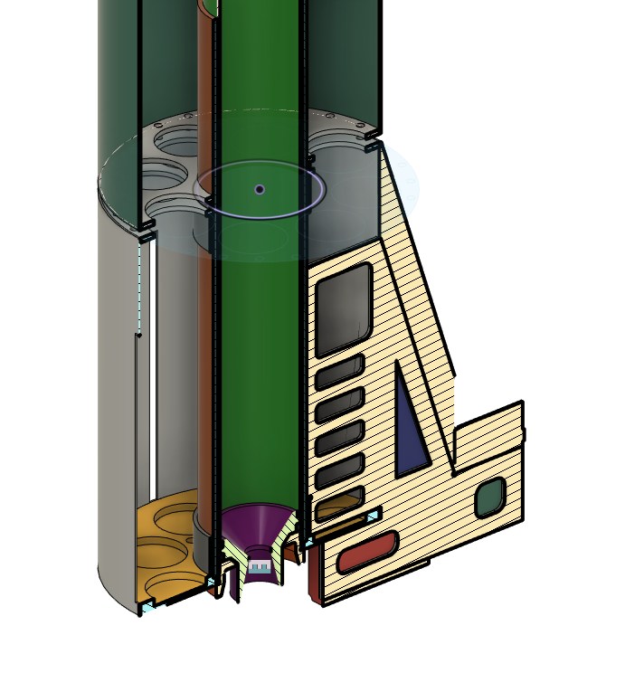 Ich plane den Bau einer Mercury Redstone in 1:12 scale. Einiges wurde dafür schon gemacht, vor vielen Jahren habe ich hier schon einmal damit angefangen, dann kam der Forencrash und alles war futsch. Damals habe ich die Kapsel und den rettungsturm angefangen, die Kapsel war ein fertiger Bausatz der von mir flugtauglich gemacht wurde. Es ist da ein Altimax Simply verbaut worden, der den Schirm der Kapsel steuert sowie beim Aufstieg den Rettungsturm abtrennen soll. Jetzt habe ich angefangen die Rakete selbst zu entwerfen und habe dazu Fusion360 genommen, sie wird komplett in 3D konstruiert. Der Körper wird aus dünnem GFK-Rohr gemacht, selbst gewickelt, die Fins werden teils gedruckt, und sind innen aus Sperrholz, was die Kräfte bei der Landung aufnehmen soll. Hier schon einmal einen Blick ins Innere der Flossensektion, wo ich nur ein Fin angelegt habe damit es übersichtlich bleibt: