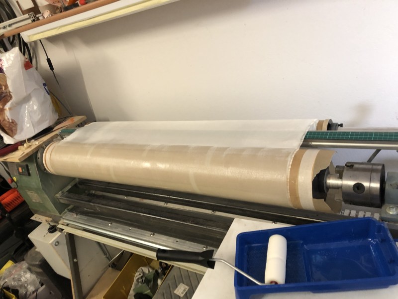 Ein Rohr wurde laminiert, 4 Schichten 160g-Gewebe auf einen 153mm Kern. Gewickelt wurde auf meiner Wickelbank, eine umgebaute Drechselbank mit CNC-Steuerung, damit kann ich wickeln, fräsen, schleifen usw. Sehr praktisch. Leider muss ich jetzt noch auf neuen Wischfüller warten, bevor ich damit weiter machen kann.