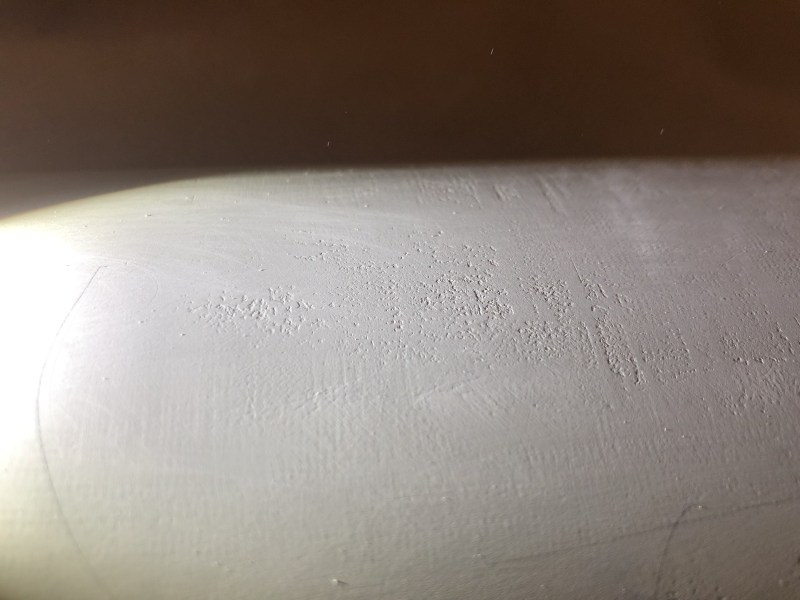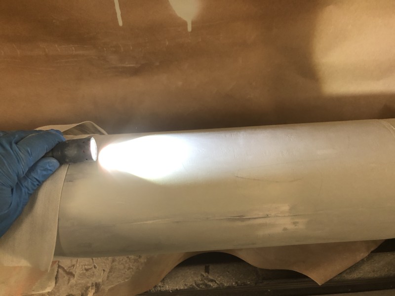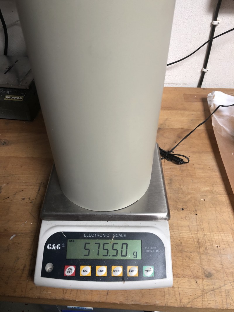 Nach dem laminieren kam dann Porenwischfüller drauf, Polyesterspachtel und Spritzspachtel, das Ganze 2x bis alles glatt war. Da ich das Rohr wirklich aalglatt haben wollte habe ich dann mit Taschenlampe und Lichtschein über die Schatten die letzten Unreinheiten gesucht, man findet da gigantische Krater die man sonst nicht so einfach sieht. Nach einer Stunde Schleifen waren die letzten Poren dann auch weg, eine letzte Schicht Spritzspachtel und fertig war das Rohr. 575 gramm bei 94 cm Länge sind so schlecht nicht.