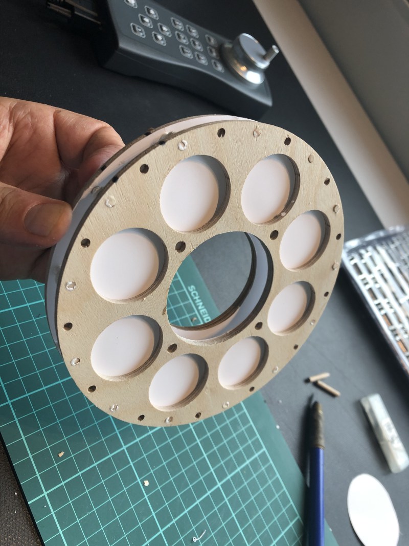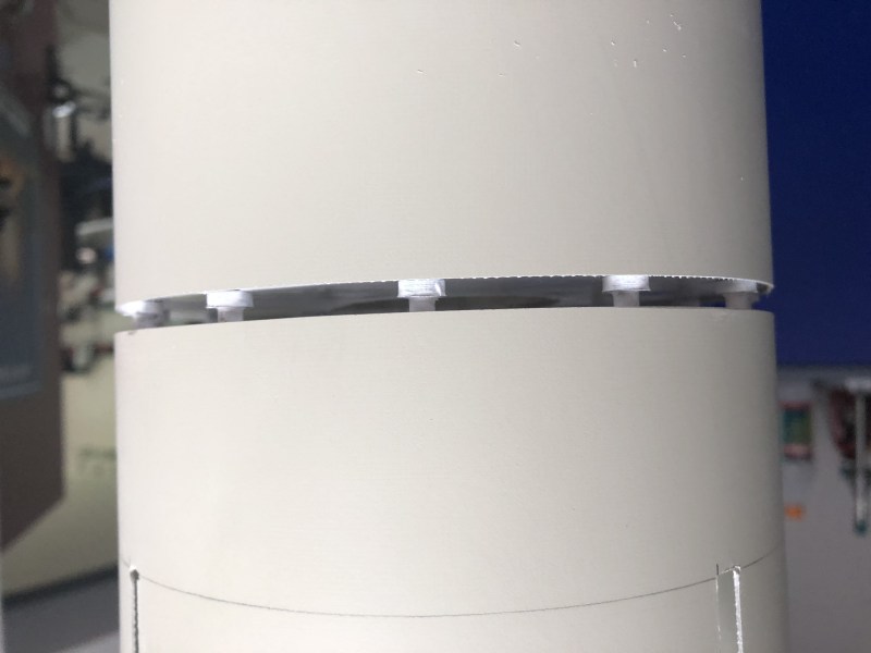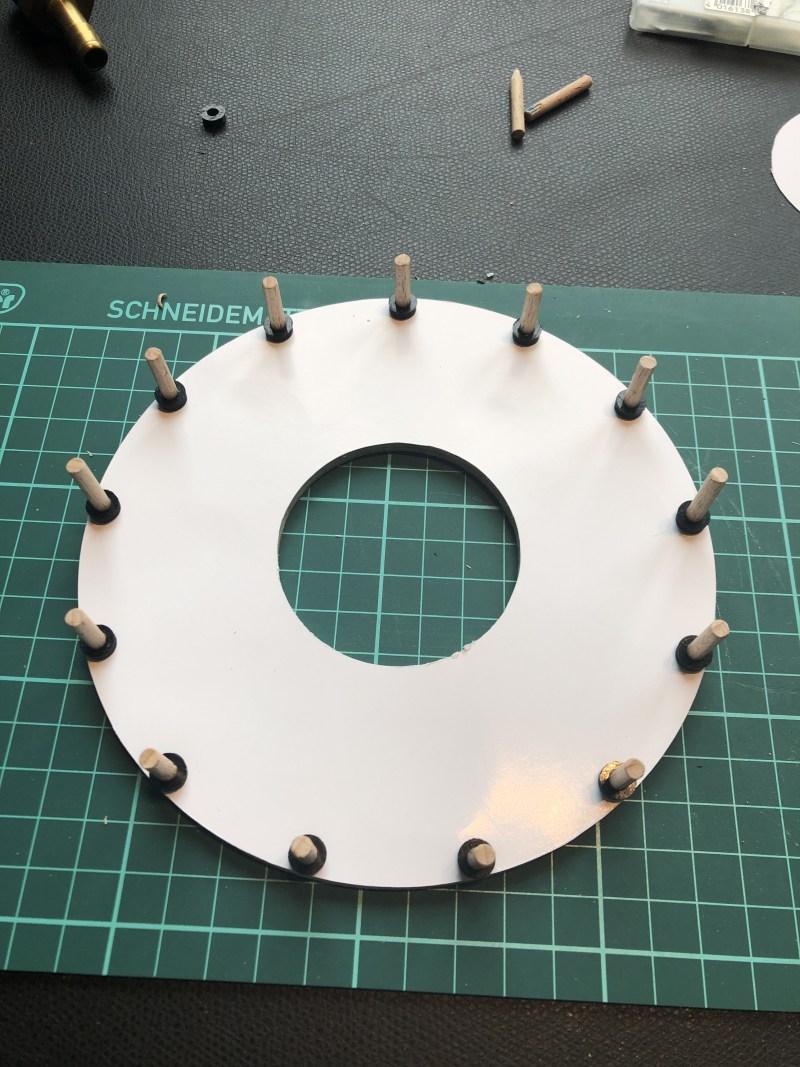 ich konnte mal wieder an der Redstone basteln, heute war die Trennstelle dran. Dazu wurden zwei Spanten erst mal mit weißer Pappe beklebt um die Öffnungen zu schließen. Dann 13x 4mm Holzstifte reingekloppt, kleine gedruckte Scheibchen drauf und der Zweite Spant drauf. Das ganze dann grob angepinselt damit es innen schon mal alles weiß ist, wird dann bei der Lackierung noch so wie es werden soll. So sieht es beim Original aus: