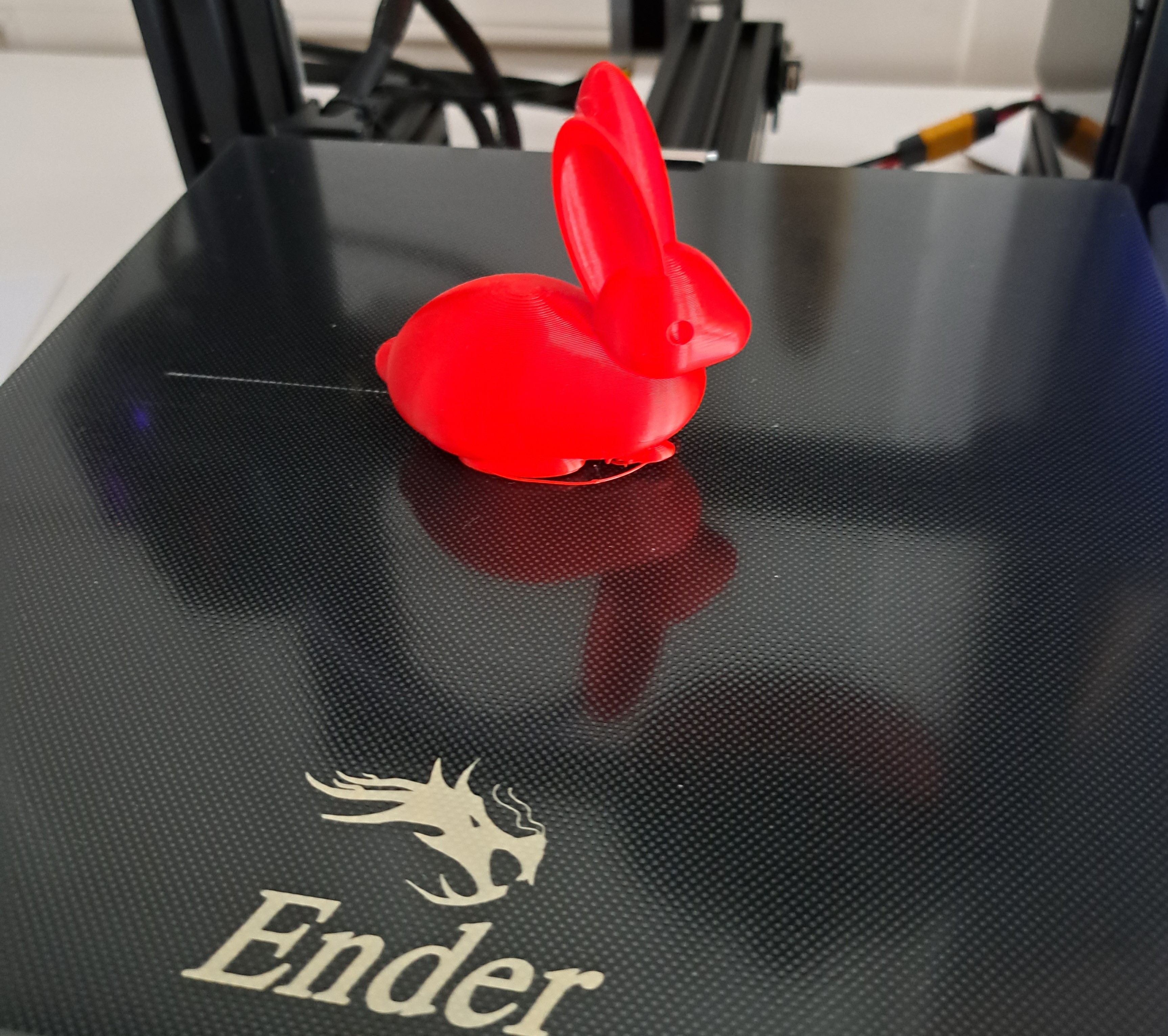 Ich habe jetzt auch so ein Spielzeug. Das Einrichten war so eine Wissenschaft für sich...aber hat geklappt, und der Hase sieht auch ganz gut aus. Am Anfang war die Platte wohl nicht heiß genug, obwohl ja bei PLA 60 °C ausreichend sein sollen.