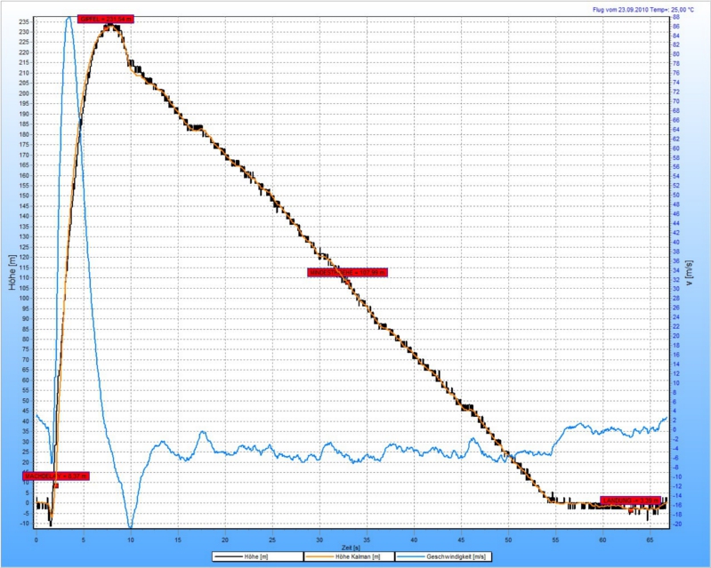 Servus, Nachdem heute so schönes Wetter war und ich schon längst mal wieder einen Wasserrakete starten wollte habe ich das Equipment entstaubt und wieder startklar gemacht. Außerdem noch schnell ein Modul für den Altimax gemacht und alles gewohnt provisorisch zum großteil mit Panzertape montiert (Den Altimax natürlich schön sicher und stabil mit Flugzeugsperrholz und Epoxy). Für die Bergung hab ich das bewährte TomyTimerModul verwendet und den Altimax nur als Höhenlogger mitfliegen lassen. Ok, die schönste Variante ist das mit den Pappflossen vielleicht nicht, aber es funktioniert und ging schnell, denn mein Hauptaugenmerk liegt momentan eigentlich beim Wiederaufbau der Elypso. Aber wenn Thomas seine Rakete auf 35 bar startet kann ich nicht mehr mithalten, weil ich nur den SKS habe, also musste möglichst bald gestartet werden. Mit Erfolg! Kurz die Daten: Volumen: ziemlich genau 9L Wassermenge: 2,2L (relativ wenig, aber die Simulation sagt es so vorraus) Länge: 2,45m und davon ca. 2m Drucktank Durchmesser: 1L Flaschen - Apollinaris Gewicht: 810 g ohne Wasser Druck: 10 bar Düse: 22mm  Launchtube: geschätzte 1,6m berechnete Höhe: 289m gemessene Höhe mit Altimax: 239 m sagt der Terminal! Die leichte Bauweise macht sich einfach bezahlt! Die Hälfte der Maisfelder ist zwar schon abgeerntet, aber leider hat der Wind in genau die falsche Richtung gedreht und sie landete in einem, aber relativ nah am Rand wodurch sie schnell wieder geborgen war! Ohne überreiben zu wollen muss ich aber sagen, dass der Flug letztes Jahr beim Solaris Fliegen rein subjektiv deutlich höher war (da war sie auch etwas leichter, wegen der Elektronik). Ein Foto "on Pad" stell ich gleich rein. Vom Start hab ich ein Video gemacht, bei dem ich etwas schnell hochgezogen habe, aber der Start ist drauf. Wenn ich ein passendes Kabel finde lade ich es gleich hoch, ansonsten nächste Woche wenn ich wieder in München bin. Hier schon mal die Beweisgrafik vom Altimax: Man sieht dass der erste Schirm erst ein Stück nach dem Gipfelpunkt öffnet und der zweite nochmal etwas später. Der kurze Schlenker nach unten ganz am Anfang ist etwas komisch, aber vielleicht kommt das durch die Hohe Startbeschleunigung + etwas flexibles PET.