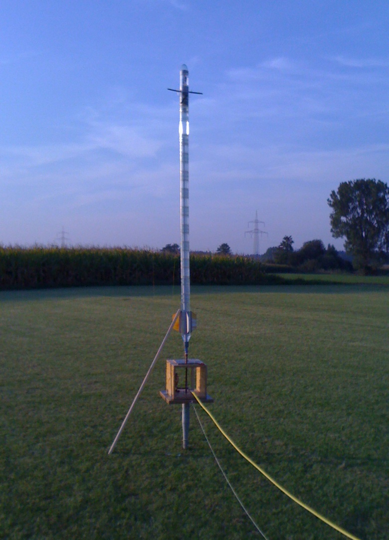 Nein, der Altimax war bei diesem Flug nur als Höhenlogger dabei, weil das Servomodul nicht fertig ist. Geborgen wurde klassisch mit Aufziehtimern. Hier noch das Bild vorm Start (das ganze ragte über 3,50m in die Höhe und natürlich habe ich vergessen den Altimax im gekippten Zustand einzuschalten...) aber mit dem High-Tech-Stabilisierungsstab  bin ich noch dran gekommen