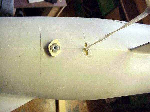 Wenn ihr wissen wollt, wie ich eine Einschlagmutter in ein Rohr einbaue, wo man von innen nicht mehr heran kommt? Hier der Trick mit einem Bindfaden. Es wird ein Spalt gefräst, wo man die in einem kleinen Stück Sperholz gefasste Einschlagmutter quer durchschieben kann. Zuvor wird durch die Mutter ein Bindfaden gesteckt, am anderen Ende ein dicker Knoten, mit dem die Mutter an die Innenwandung gezogen wird. Epoxy drauf, warten bis der Kleber angezogen hat, dann den Bindfaden abschneiden. Der durchgestoßene Knoten verbleibt im Rohr. Folgende Datei wurde angehängt: |