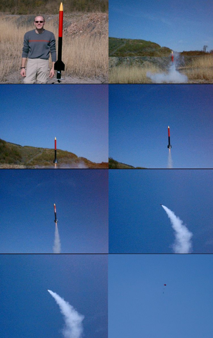 Das war ein G64-4W, die Untergrenze der Motorisierung meiner MiniBBX. Habe sie schon mal mit nem H180 geflogen, dabei hatte die Rakete aber derart viel Spin, das der Film nicht sehr schön geworden ist. Jürg und ich wollen, sobald ich den Spin weg hab mal einen versetzten Start machen: Erst meine MiniBBX mit der Kamera und anschliessend er mit seiner grossen BBX hinterher. Na mal sehen ob und wann das klappen wird.