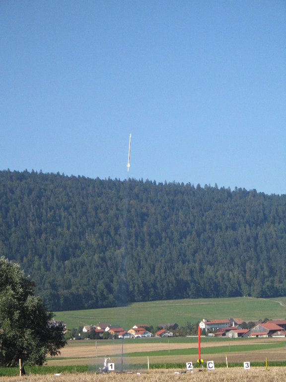 Dank auch an Roman für die letzten 3 Bilder in diesem Fred und das Video, sowie Stefan S. der mir einen passenden Schirm geliehen hat. Das Flugvideo gibt es hier Der Flug war schnurgerade und der Sound einfach nur geil!!! Leider hatte sich der Schirm verwickelt, sodass die "Landung" recht hart ausfiel. Außerdem war die Austoßladung etwas zu klein bemessen(beim Bodentest hat alles perfekt funktioniert) sodass der größte Teil des Schockbandes, gebremst durch das rauhe Nomex Shied, im Rohr blieb und der Schirm so keine Schance hatte sich zu "entwurschteln". Folge: 3 Stauchungen im Körperrohr die jedoch demnächst mit GFK-Band repariert werden Gruß Felix Sky´s not the limit!