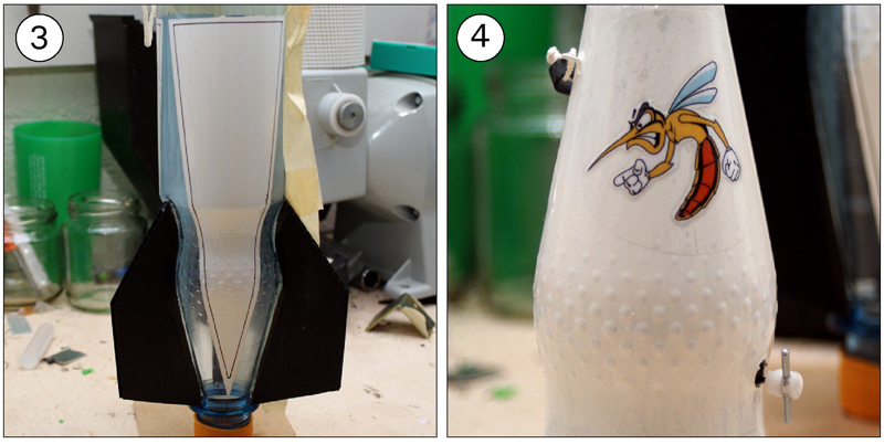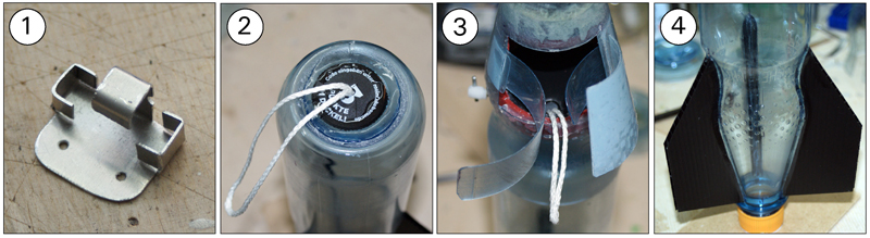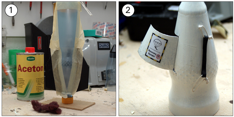 - Finnen sind angeklebt (Mit Pattex Montagekleber Special für nicht saugfähige Materialien) - Die Leine für die Fallschirmaufnahme ist am Drucktank (Kunststoffscheibe + Heißkleber) Aktuelles Gewicht (Rakete + Düse): 104g Jetzt noch den Fallschirm nähen und fertig. Hier noch ein paar Fotos: (1) Der Halter für den Tomy Timer (2) Aufnahme für die Fallschirmleine am Drucktank (Der obere Teil eines Flaschendeckels) (3) Aufnahmeleine mit Durchführung am Fallschirmmodul (4) Befestigte Finnen Geändert von WARAausKIEL am 06. März 2013 um 09:39 If You Don't Try, You'll Never Know |