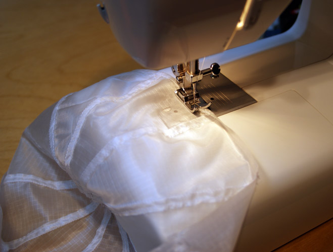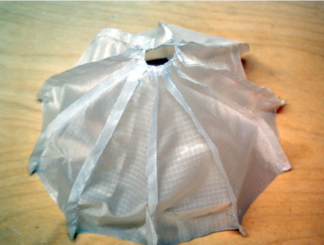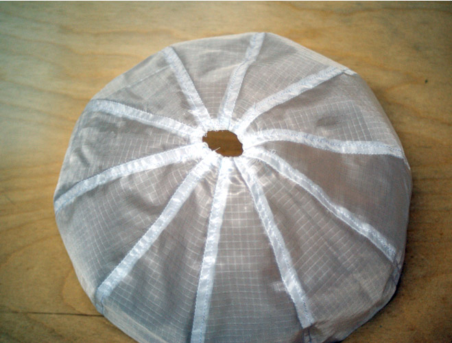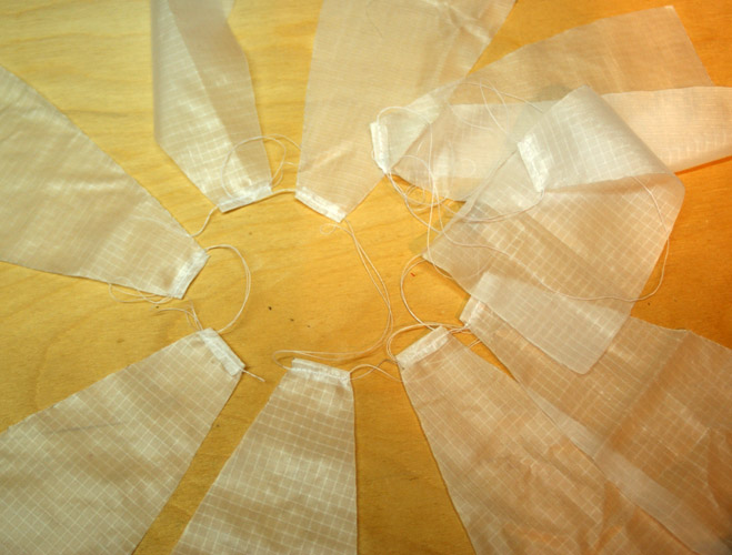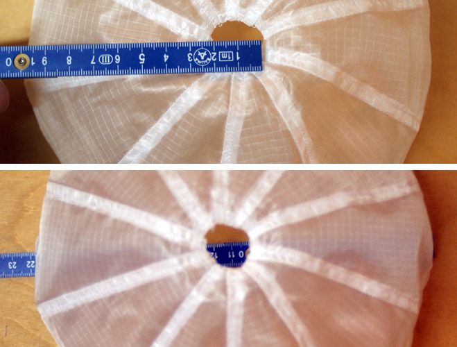 Für die Berechnung habe ich das Programm von Thomas verwendet. Siehe auch: Fallschirm Schnittmuster Software, Beitrag 7625091 Berechnet habe ich einen Schirm mit einem Durchmesser von 22cm. Da die Teile mit einer offenen Kappnaht vernäht werden, habe ich die Teile heiß geschnitten (Lötkolben). Hier die Schablone zum Schneiden (1) und die ausgeschnittenen Teile (2) aus Fallschirmseide. Als erstes habe ich die Enden an dem Ausgleichsloch einfach gesäumt. (Die bleiben natürlich nicht so zusammen, ging nur beim Nähen schneller) Hier sind alle Teile einfach zusamengenäht. Hier sind die Kappnähte fertig. Anschließend noch die untere Kante einfach säumen. Und am Ende die Maße kontrollieren. Durchmesser 22cm / Ausgleichsloch 2,2 cm (Perfekt, passt genau) Da der Schirm sehr klein ist, werde ich die Leinen nicht mit Schlaufen befestigen sondern direkt an den Schirm nähen. If You Don't Try, You'll Never Know |