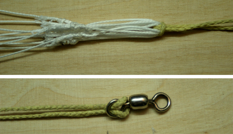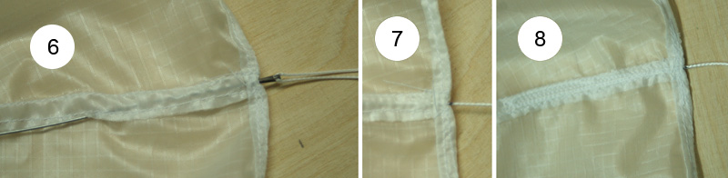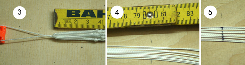 Montage der Fallschirmleinen Für die Leinen habe ich Dyneema Leine aus dem Drachenbereich genommen. Technische Daten: Bruchlast 95daN (ca. 96,9 kg), 8fach geflochten, ca. 0,7 mm dick. A. Schlaufen an den Leinenenden (1) Zum Knoten der Schlaufe habe ich den einfachen Achterknoten genommen. Spleißen sieht sicherlich schöner aus, ist bei einer so dünnen Leine aber echt ein Krampf und meiner Meinung nach aus technischen Gründen nicht zwingend erforderlich. Ich habe es jedenfalls im Drachensport noch nie erlebt, dass eine Dyneema Leine auch unter extremer Belastung an einem Achterknoten reißt. (2) Das kurze abstehende Ende habe ich noch festgenäht (manuell mit Nadel und Faden). Bei einem anderen Schirm habe ich bei diesen kurzen Stücken immer nur das Ende (ca. 5mm) mit einer Spleißnadel in die lange Leine eingezogen. Ist genauso aufwändig wie das Annähen, sieht aber doch besser aus. B. Leinen abmessen (3) Alle Schlaufen zusammenfassen und an einem Punkt fixieren. Dann die Leinen stramm ziehen und z.B. einen Zollstock (Gliedermaßstab) am Anfang der Schlingen ansetzen (0-Punkt). (4) Die gewünschte Leinenlänge abmessen > Wer sich jetzt wundert, dass ich bei einem 22ger Schirm 80cm lange Leinen nehme. Keine Angst, diese Leinen sind für einen 42ger Schirm. Bei dem 22ger sind die Leinen 42cm lang. < (5) Und die Leinen an dieser Stelle markieren. C. Leinen an den Schirm nähen (6) Das Leinenende mit einer Spleißnadel in die Kappnaht einziehen. Tipp: Bei Schirmen, bei denen die Kante doppelt gesäumt wird, würde ich die Leine vor dem Säumen der Außenkante in die Kappnaht einziehen. Leine ab der Stelle, an der sich nach dem Säumen die Außenkante befinden wird, in die Naht einziehen und dann säumen. Man kann die Leinen natürlich auch schon mit dem Erstellen der Kappnaht einnähen. Aber dann muss man auf zwei Sachen gleichzeitig achten. Zum Einen soll die Kappnaht sauber werden und zum Anderen darf die Leine dabei nicht verrutschen. (7) Die Markierung an der Leine genau an der Kante des Schirms ausrichten. (8) Die Leine festnähen. Ich habe zweimal auf dem Saum entlang genäht (gerader Stich, kurze Stichlänge). So kann die Leine schon mal nicht mehr aus der Kappnaht rutschen. Dann 2 – 3 mal auf der Kappnaht. Bei so dünnen Leinen ist es gar nicht so leicht, die Leine zu treffen. Es ist hilfreich, wenn man die Leine in der Kappnaht ganz an eine Seite schiebt und dann erstmal ganz dicht neben der Leine lang näht. So kann die Leine innerhalb der Kappnaht nicht mehr verrutschen. Im nächsten Schritt näht man dann direkt auf der Leine entlang (gerader Stich, kurze Stichlänge). D. Leinen zusammenfassen Für die Zusammenfassung habe ich Kevlar-Leine genommen (hatte ich noch rumliegen). Durch Spleißen habe ich mit der Kevlar-Leine im ersten Schritt einen Ring erstellt. Dann die Schlaufen der Fallschirmleinen mit einer Schlinge zusammenfassen und an dem anderen Ende der Kevlar-Leine noch einen Wirbel anbringen. Der Wirbel ist auch aus dem Drachenzubehör (Wirbelkarabiner). Den Karabiner habe ich entfernt. An dem anderen Ende des Wirbels kann jetzt der Rest (Schockband, Leine, ... ) befestigt werden. Gruß Marcel Geändert von WARAausKIEL am 15. April 2013 um 09:50 If You Don't Try, You'll Never Know |
