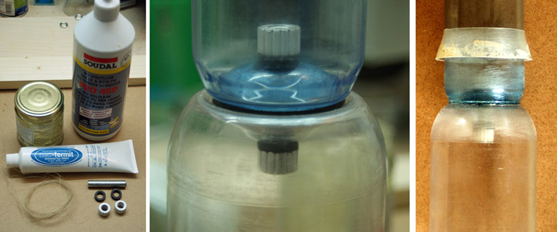 Links - Die benötigten Teile für die Verbindung. Da das Gewinde an der Gewindestange nicht selbstdichtend ist, habe ich mit Hanf und neo-fermit gearbeitet. In dem Glas ist Pattex Montagekleber 6-fach. Die Aluhülsen mit Innengewinde habe ich noch gekürzt.