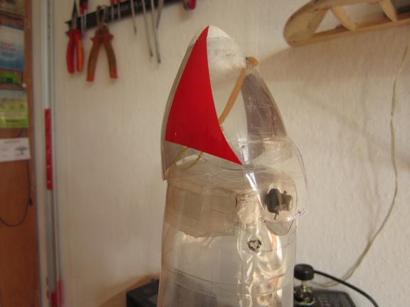 Wie bei meiner Terri-Rakete ist es wieder eine Klappspitze, die durch ein (innenliegendes) Gummiband am Tommy-Timer eingehängt wird. Der Timer wird vor dem Start durch einen Kabelbinder blockiert, den man von unten ins Getriebe des Timers steckt. Klappt bei meinen beiden anderen Raketen hervorragend - hier allerdings ist durch den Klein- und Leichtbau die Handhabung dann schon ziemlich fummelig. Ich brauch so ne Art Häkelnadel aus Draht um das Gummiband richtig einzuhängen und korrekt aufzuwickeln. Die Vortests des Systems waren dann auch nicht besonders ermutigend. Am Ende war das aber egal.....