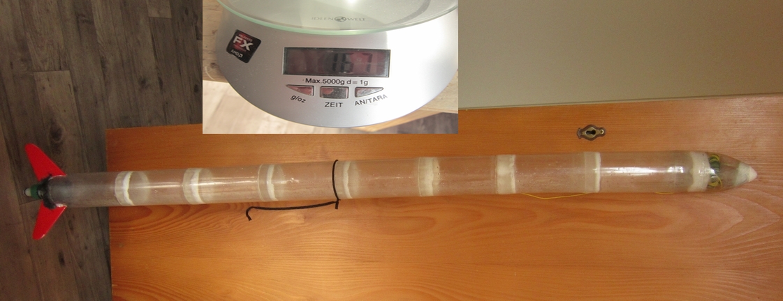 Das Projekt-Ziel ist jedenfalls erreicht, die gesamte Rakete mit Bergungssystem wiegt flugfertig 167 g.Mit 3.9 L Volumen damit bei 43 g/L und deutlich unter den avisierten 50 g/L. Auch das hat allerdings lustige Konsequenzen, die ich in meinem Flugbericht erläutern werde.