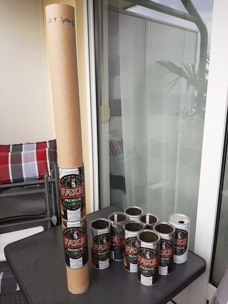 Jetzt die FAXE Dosen zur Probe auf die Körperrohre aufgefädelt... Verglasen war gestern, heutzutage wird verblecht....;-)))