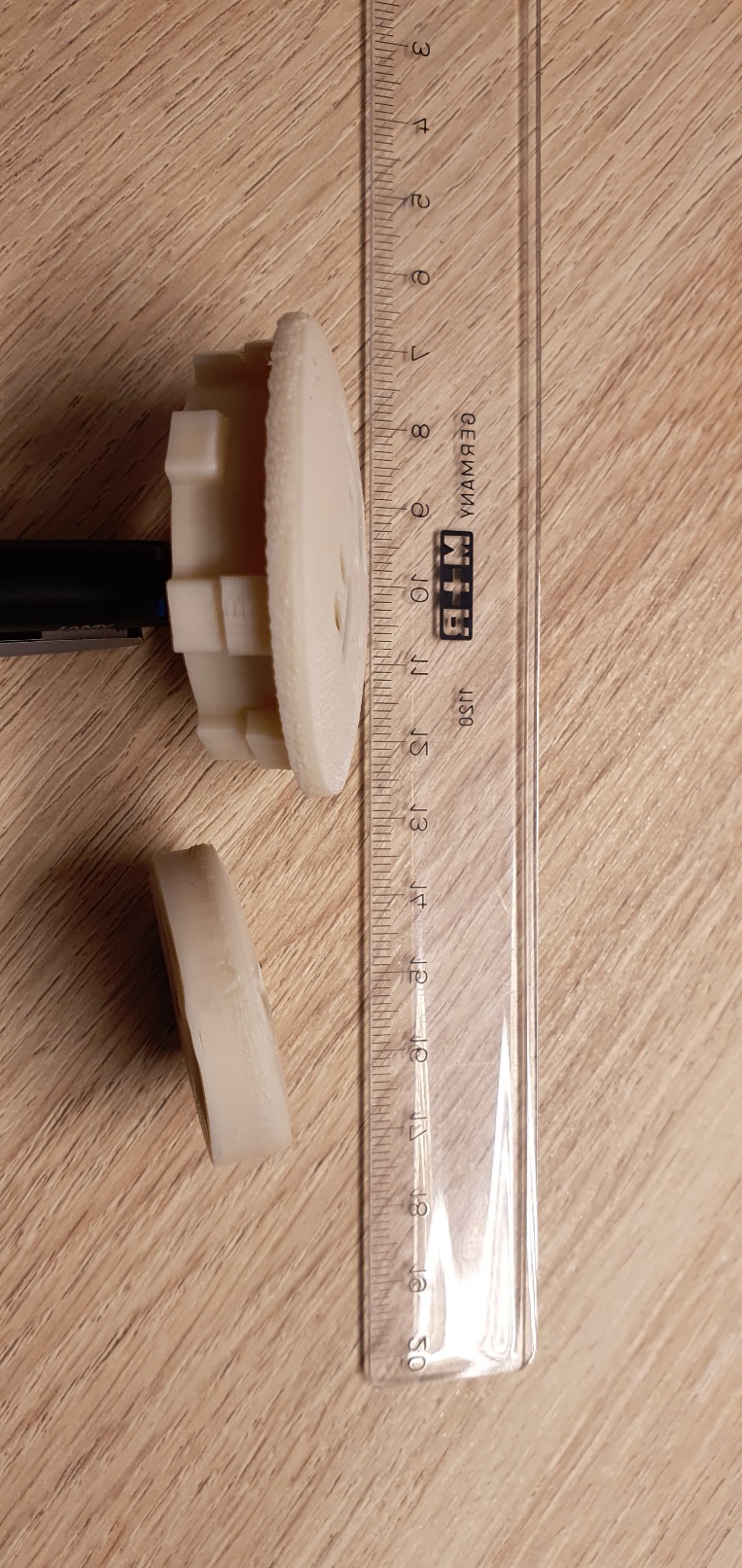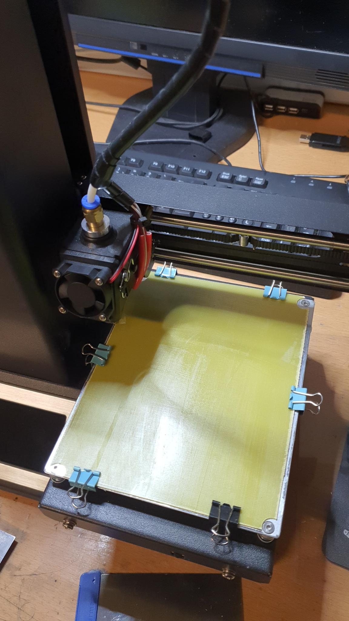 Nach einigen Drucken hat sich raus gestellt, dass die Haftung zwischen Druckfolie und Druck perfekt war, nur leider nicht der Kleber unter der Auflage. Das Werkstück hat die ganze Folie vom Heizbett gelöst.